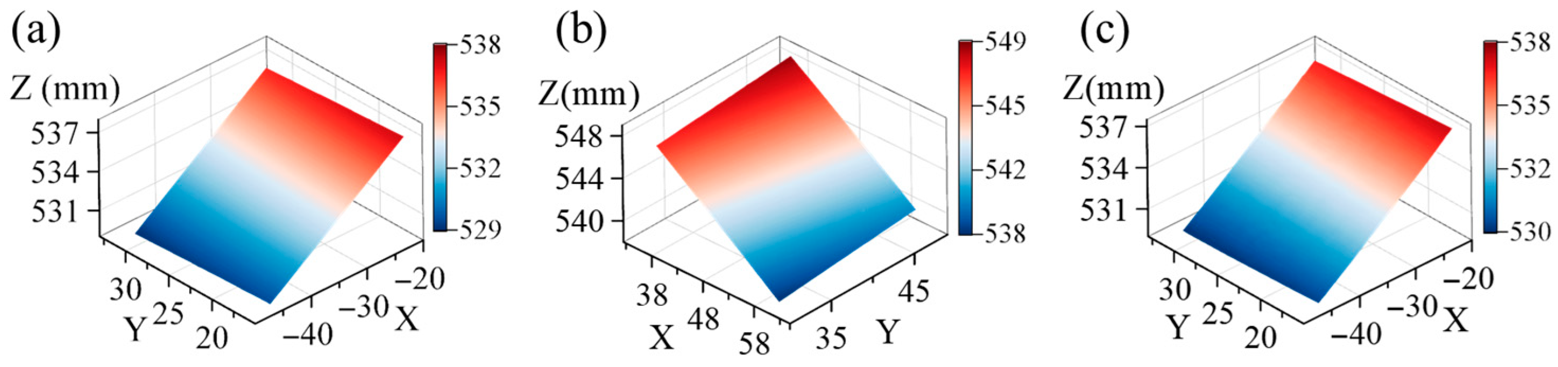 The ceramic plate was coated with water-transfer speckles, with an average speckle diameter of about 3–5 pixels. It was mounted on a high-precision three-axis translation stage (precision of 5 μm) and positioned within the common field of view of four virtual cameras. The overlap area was approximately one-fifth of the total length of the image, and a region of 192 × 308 pixels was selected as the region of interest (ROI). Initially, the morphology of the ceramic plate was measured, as depicted in