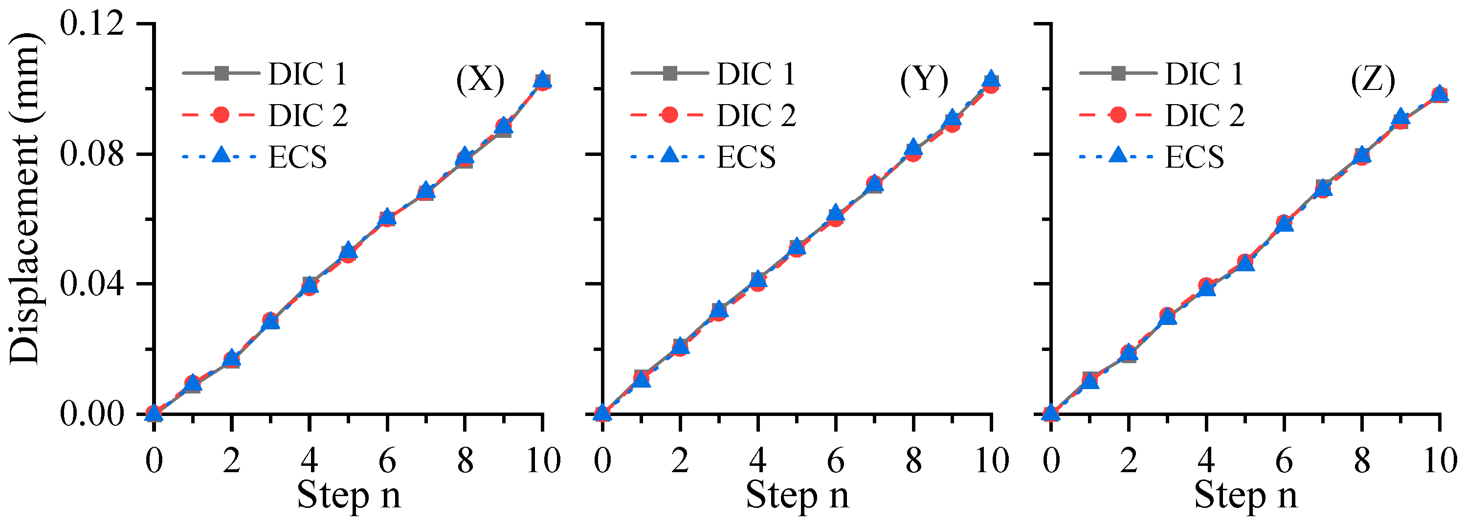 Figure 7, a comparative analysis reveals a high level of agreement between the displacement values obtained from the multi-camera DIC system and those recorded by the ECS, which demonstrate that the proposed method achieves a high precision.