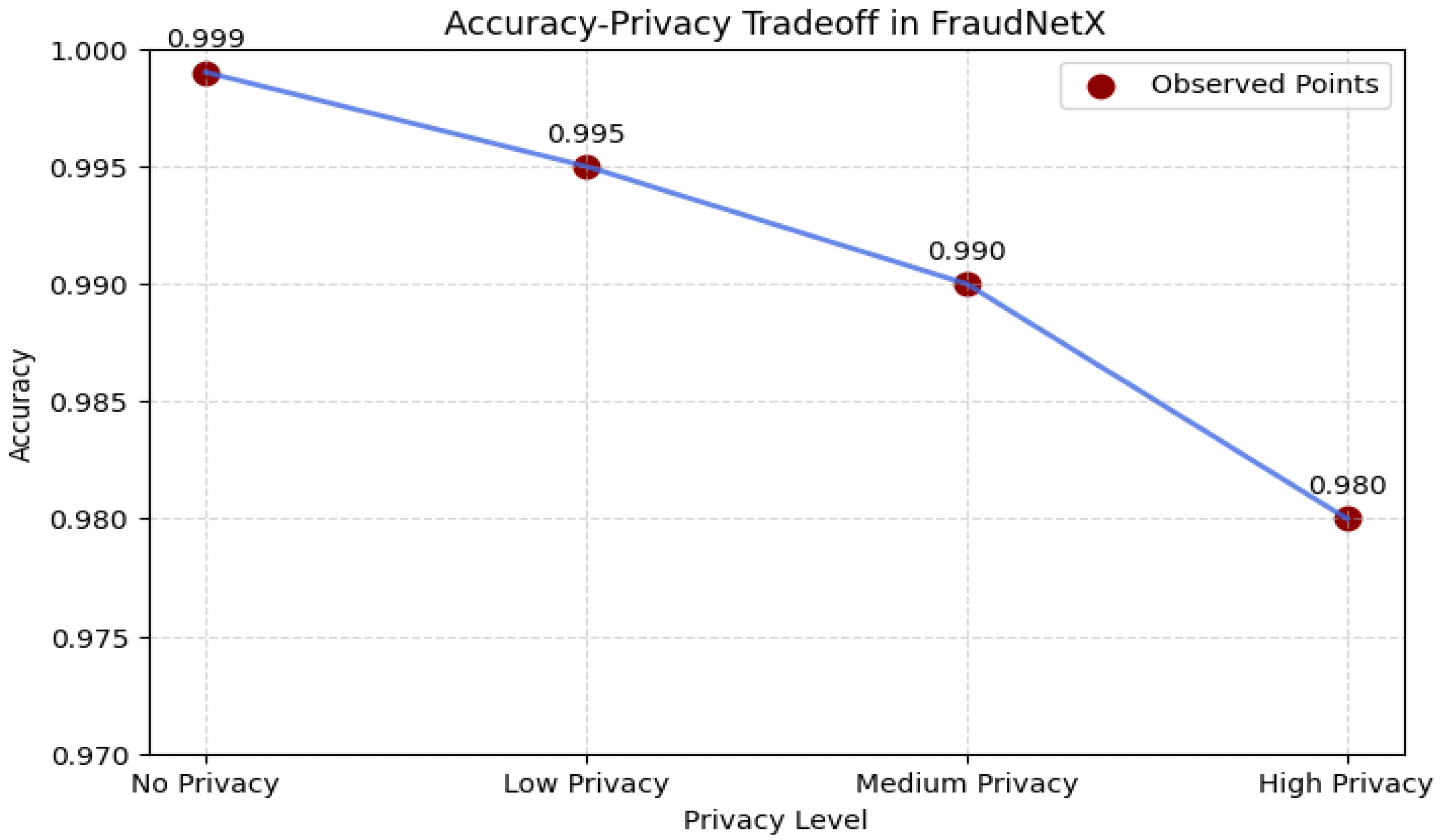 As indicated in the experimental assessment, FraudNetX has a high accuracy and F1-score of more than 99% and at the same time has high data privacy in the federated setting.