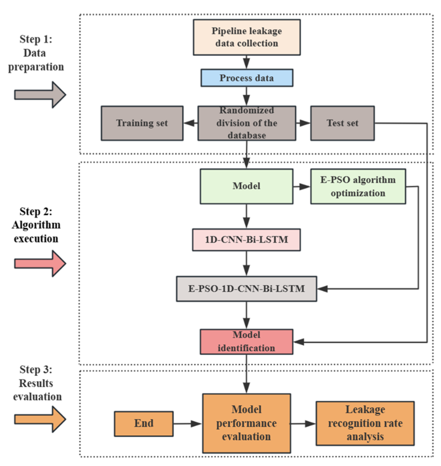 When identifying pipeline leaks, the optimized EPSO-1D-CNN-Bi-LSTM model adopts a continuous iterative process. By establishing 1D-CNN and Bi-LSTM models suitable for pipeline leak detection, and then combining them, the EPSO algorithm is used to dynamically adjust the key parameters in the 1D-CNN-Bi-LSTM model to adapt to different leak datasets in the water supply pipeline. In this model, the prediction performance of different hyperparameter combinations varies. The key hyperparameters for the 1D-CNN-Bi-LSTM model used for pipeline leak classification and identification include learning rate, the number of convolutional kernels, and the number of hidden units (num_hidde_nunits), etc. The key hyperparameters of 1D-CNN-Bi-LSTM are optimized using the EPSO algorithm, which can find the ideal hyperparameter set to enable the model to achieve the highest recognition rate. The detailed process of enhancing the 1D-CNN-Bi-LSTM model using the particle swarm optimization algorithm is as follows: