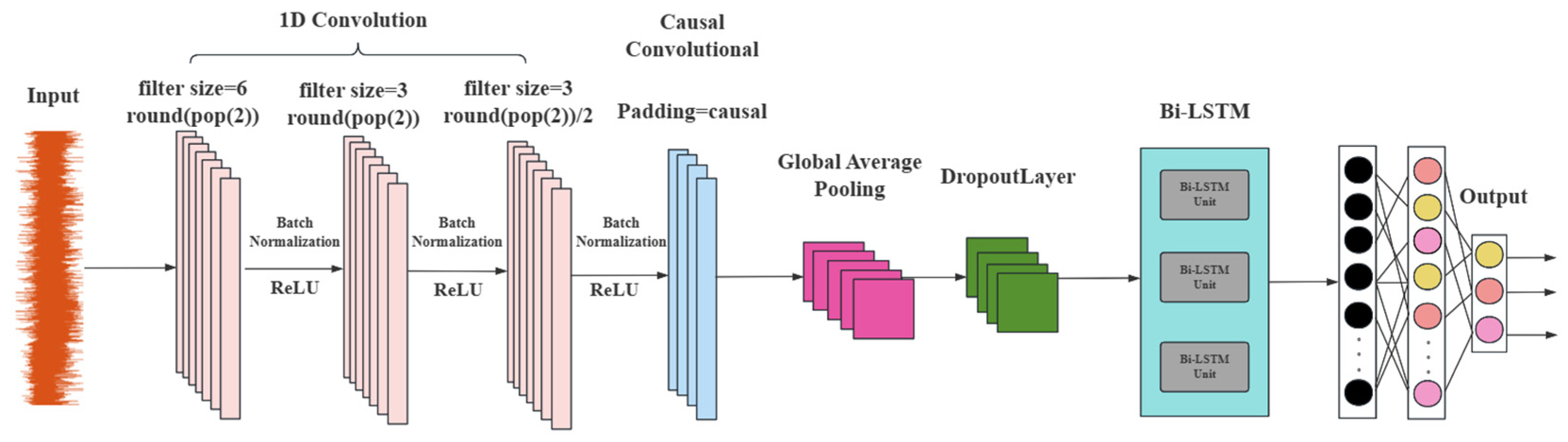During the entire convolution process, using causal convolution (Padding = ‘causal’) ensures that the output of each time step only depends on the current and previous time steps, and is not influenced by information from future time steps. This is particularly important for tasks such as water pipeline leakage detection, as in practical application scenarios where future time step information is unavailable, causal convolution can guarantee that the model’s predictions conform to the causal relationship of the actual situation, that is, the collected pipeline leakage signal and the causal relationship between whether there is leakage and various leakage conditions, thereby improving the reliability and effectiveness of the model in water pipeline leakage detection.