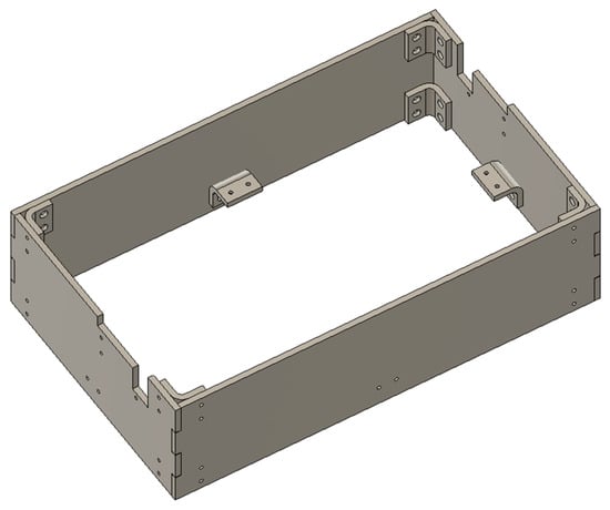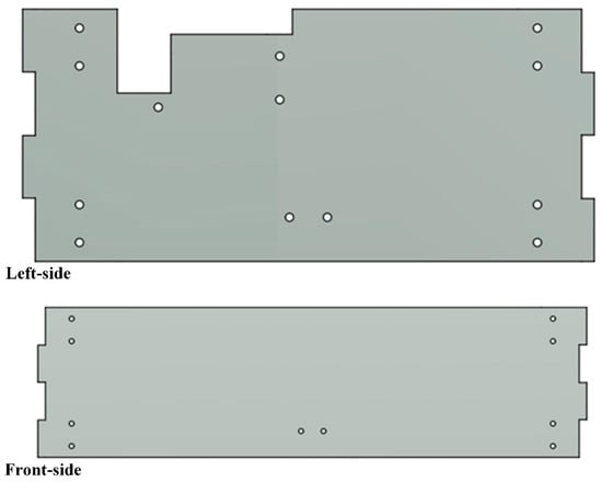 From the outset, the project was subject to a “compact design” requirement, stipulating that the entire robotic arm assembly must fit within a rectangular volume of 366 × 226.3 × 100 mm. Considering the functional requirements of the robotic arm and the dimensional constraints, this overall volume was divided into two compartments measuring 366 × 226.3 × 60 mm and 366 × 226.3 × 40 mm, respectively. The 60 mm-high compartment houses the robotic arm, while the 40 mm-high compartment accommodates the battery, circuit boards, cameras, and other hardware. These two compartments are separated by a mounting panel, on which all hardware components are installed. Following the same manufacturing approach as the hull, the mounting panel is fabricated from laser-cut acrylic and secured to the hull using the panel connectors described earlier. Mounting holes for the various hardware components are pre-designed into the panel. The layout of the panel and its mounting holes is shown in Figure 7.