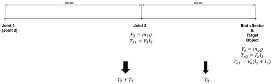 The initial goal of the robotic arm’s gripping function is to grasp a 0.1 kg object moving at an acceleration of 0.05 m/s2 in a gravity environment on the earth. To simplify the computational process, the authors will first calculate the required torque for each joint motor of the equivalent target in a zero-gravity environment, and subsequently account for the effects of gravity. According to some related research, the general order of magnitude is that the capability to lift 2 kg on Earth corresponds to moving approximately 1000 kg in space [21,22,23]. Therefore, to meet the design dimensions for this project in a space environment, and taking into account a safety margin, the design specifications in an ideal zero-gravity environment were adjusted to a payload capacity of 20 kg and an acceleration of 0.05 m/s2.