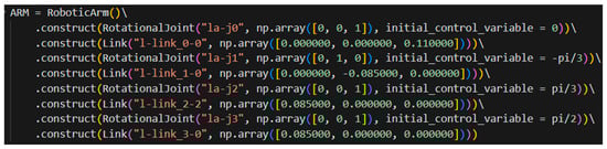 As previously mentioned, the primary objective of the simulation tool developed in this study is to enable rapid iteration of the current design using skeletal models. This approach allows minor structural adjustments to be reflected by modifying several relevant numerical parameters in the component construction process, rather than repeating the full cycle of modeling–exporting–importing–adjusting. The following section presents a practical example to substantiate this feature of the simulation tool. The project team previously procured a Dofbot robotic arm from Yahboom as a verification platform for algorithm development [25]. The Yahboom Dofbot is a six-degree-of-freedom robotic arm, with two of its degrees of freedom dedicated to controlling the end-effector’s orientation. As illustrated in Figure 11, this code snippet demonstrates the construction of the skeletal model for the Yahboom Dofbot. It is evident that its configuration closely resembles the configuration code shown in Figure 10 for the custom-designed robotic arm in this project, with adjustments made only to the number of revolute joints, link lengths, link orientations, and joint axis directions.