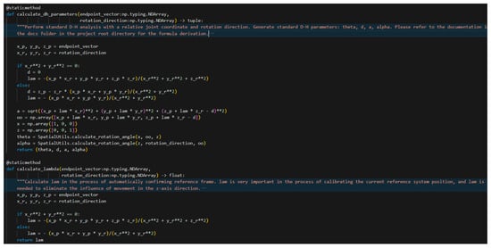 As noted earlier, from the construction of the skeletal model, the values of and can be determined. Consequently, substituting the values of and accordingly allows , , , to be computed. Additionally, in each segment of the computation, the origin of the reference frame on the preceding revolute joint exhibits a displacement along the z-axis, which must be eliminated during calculation. In this context, the offset is given by . The code implementation corresponding to the mathematical derivation presented above is shown in Figure 14.