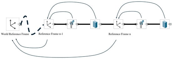 In the previous section, an improved automated reference frame construction process based on the D-H method was introduced, with the final output of this process being the D-H table. In this section, the discussion will continue with the use of the D-H table obtained in the previous section to derive and store the overall state of the robotic arm. In this work, the analysis performed by the developed simulation tool focuses on the so-called “skeletal model.” Consequently, in the subsequent analysis process, attention is directed toward the orientation of each component (e.g., the rotation direction of a revolute joint) and the positions of its start and end points (e.g., for a link). As a result, the overall state of the robotic arm can instead be stored in terms of these key parameters. Since the complete D-H parameter table can be obtained through the mathematical computations described earlier, it becomes possible to determine the pose matrix of each reference frame in the world coordinate system using forward kinematic analysis. It is important to note that, in the earlier construction of the “skeletal model,” all pose parameters were defined relative to the preceding component. Consequently, it follows that, once the pose matrix of the preceding component is known, the pose matrix of the subsequent component can be correspondingly derived.