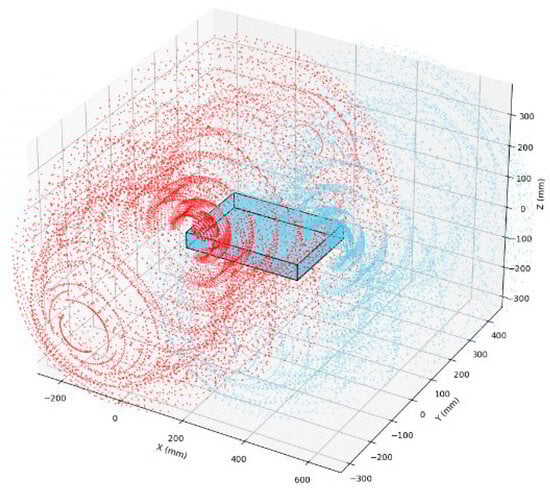 In the workspace analysis of the robotic arms, a point cloud approach was adopted as the analytical tool. Since each robotic arm possesses three degrees of freedom, the joint space of each actuated revolute joint was sampled at intervals of 5°, resulting in the workspace point cloud illustrated in Figure 17. In this figure, the red points represent the reachable positions of the left arm’s end-effector, while the blue points indicate those of the right arm’s end-effector. It can be observed that both the left and right arms exhibit a relatively large theoretical workspace, which aligns well with the operational objective of grasping target objects. Figure 17 presents the maximum reachable positions of the arms in the actual case, as viewed from the front and right. However, it should be noted from Figure 18 that a dead zone exists in the vicinity of the hull structure, implying that the arms cannot reach positions that are too close to the base. Targets must be located outside this dead zone in order to be grasped by the arms, a factor that should be taken into careful consideration in subsequent algorithm design.