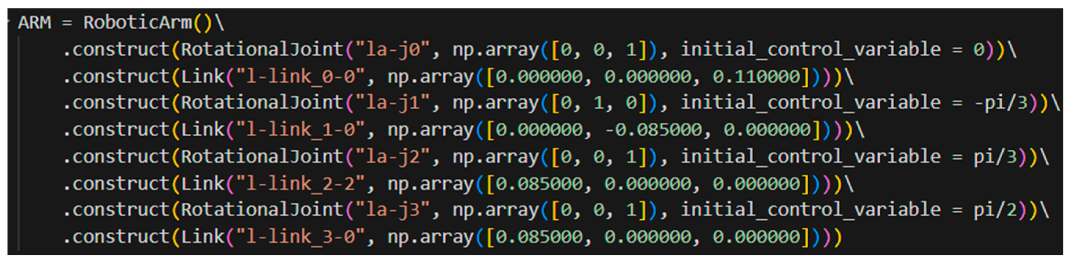 | 2: | Construct a robotic arm object (RAO) using components with .construct(). This function will add CO to RAO’s parts property. |