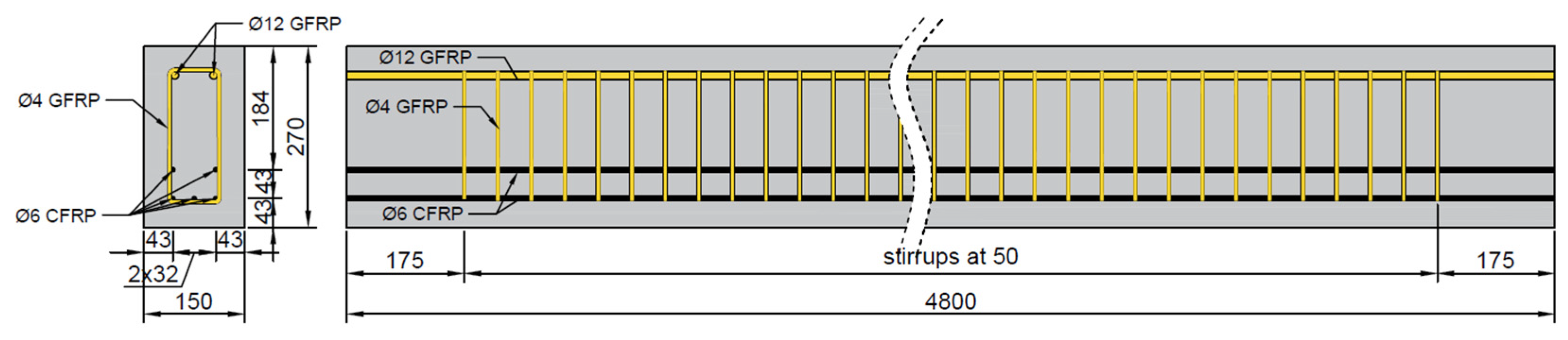 The remaining reinforcement for the beams utilized glass fiber-reinforced polymer (GFRP) bars. These GFRP bars were manufactured with a spiral wrap, which enhances the bond performance with the concrete matrix. According to the manufacturer’s specifications, the reinforcement has a guaranteed tensile strength of 1100 MPa.