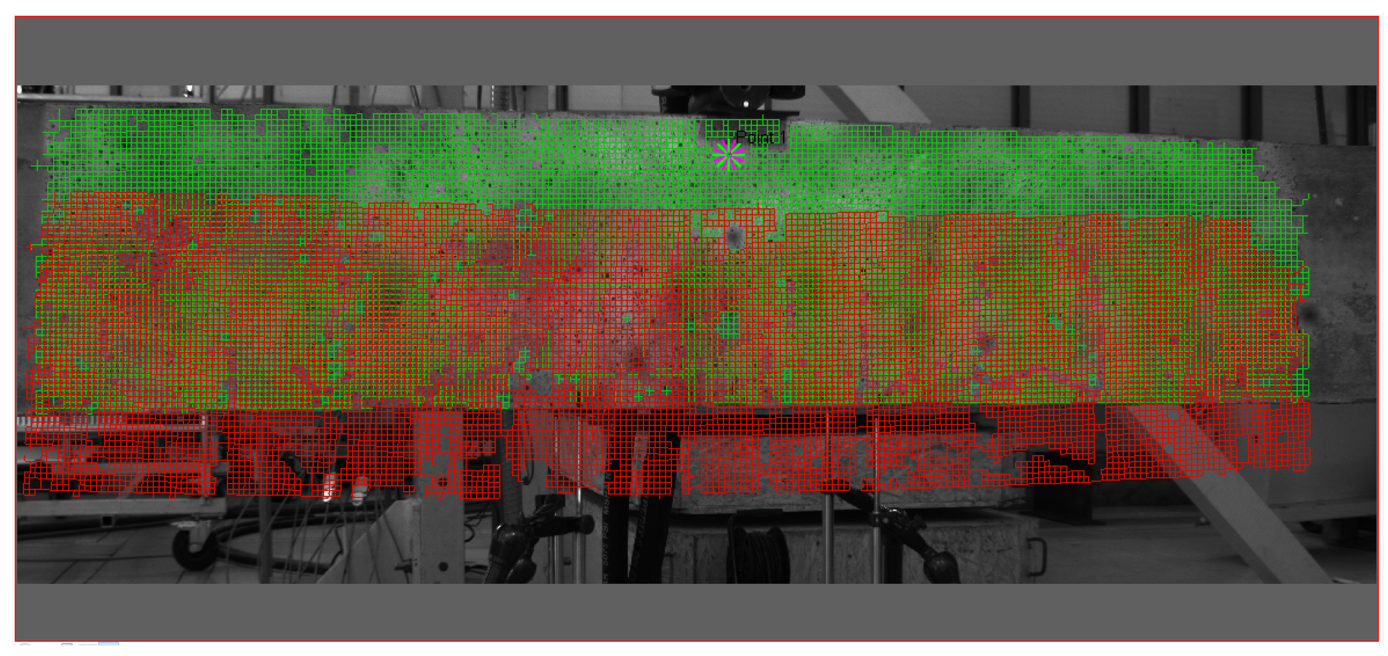 The grid of points for which the displacements and strains were obtained using DIC measurements (green—reference step, red—the final measurement).