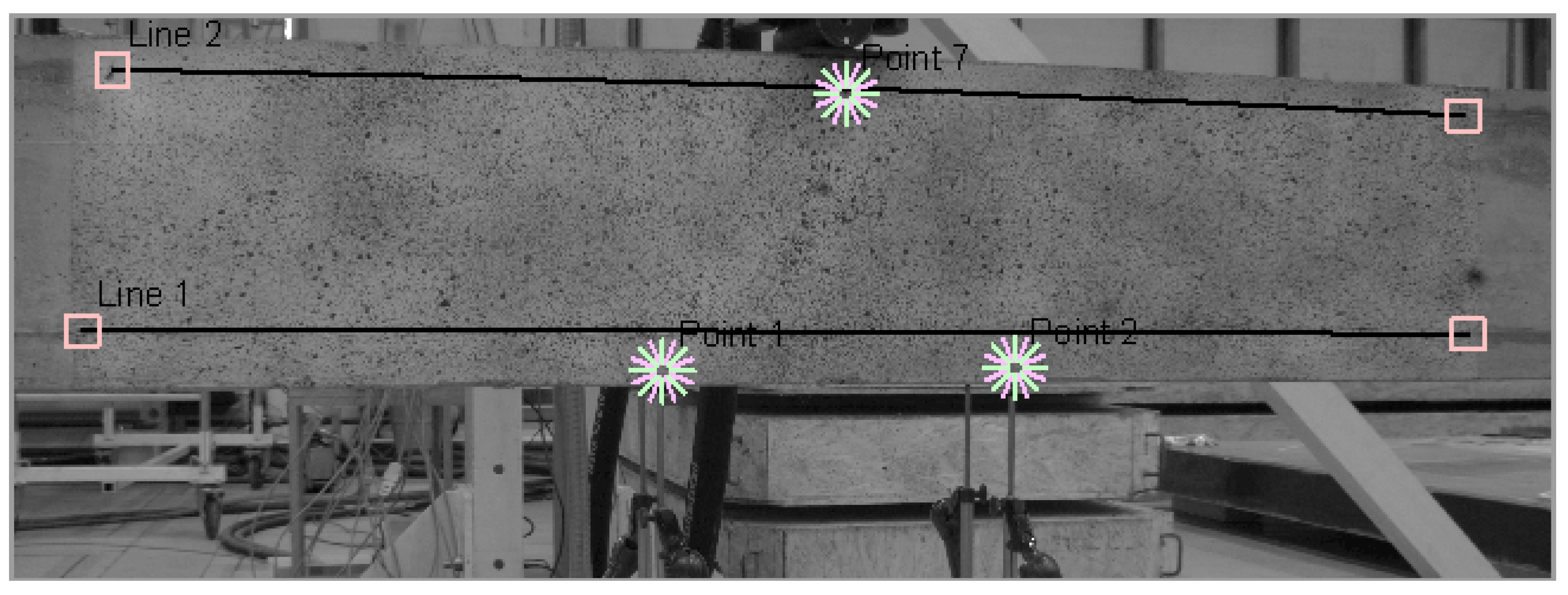 Virtual sensors: points (1, 2, 7) used for calibration of DIC measurements, and line sensors (Line 1, Line 2) used for strain comparison with DFOS.