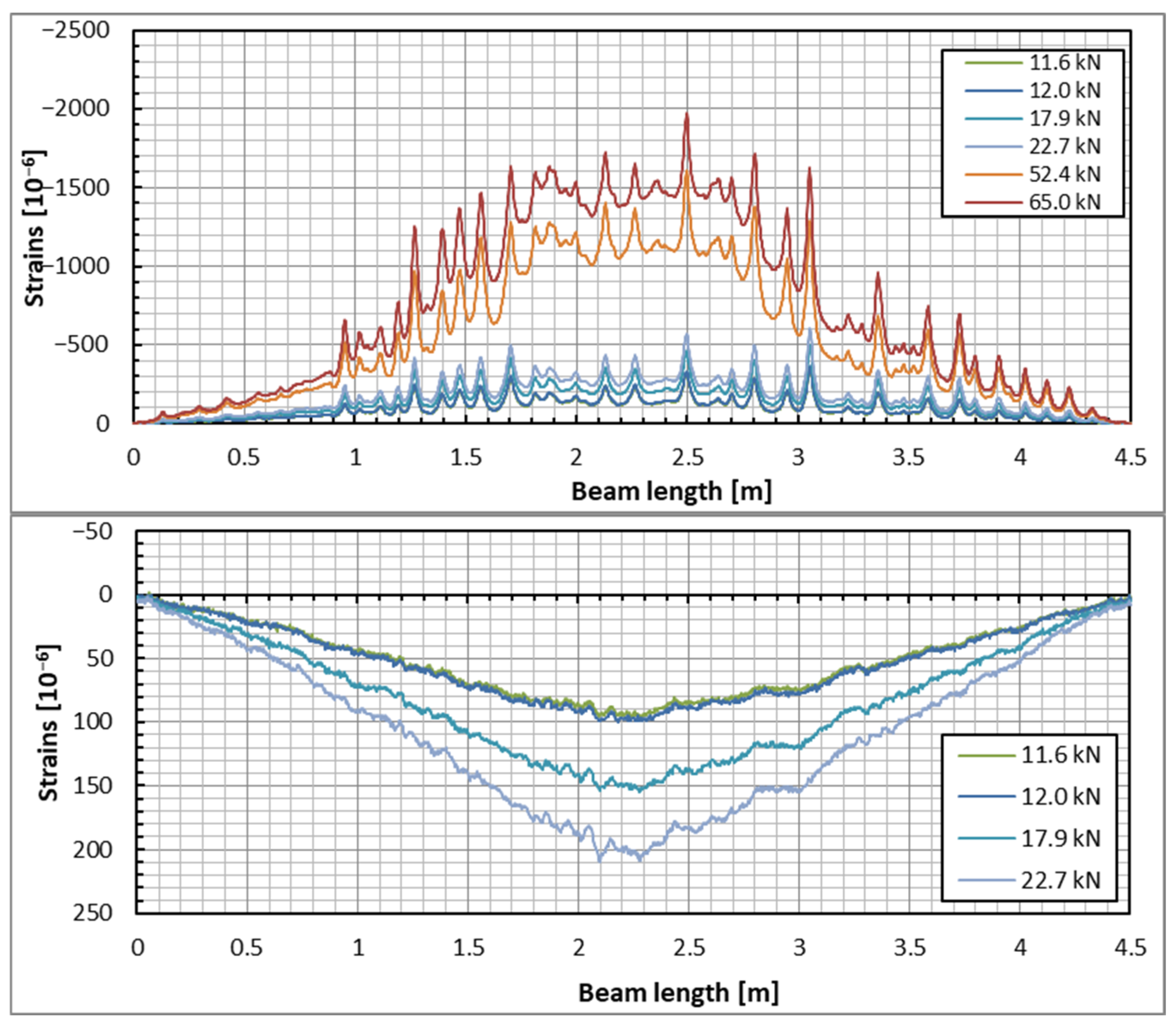 Load-strain plots in the top (upper plot) and bottom (lower plot) zones of the beam under the applied load steps (DFOS).