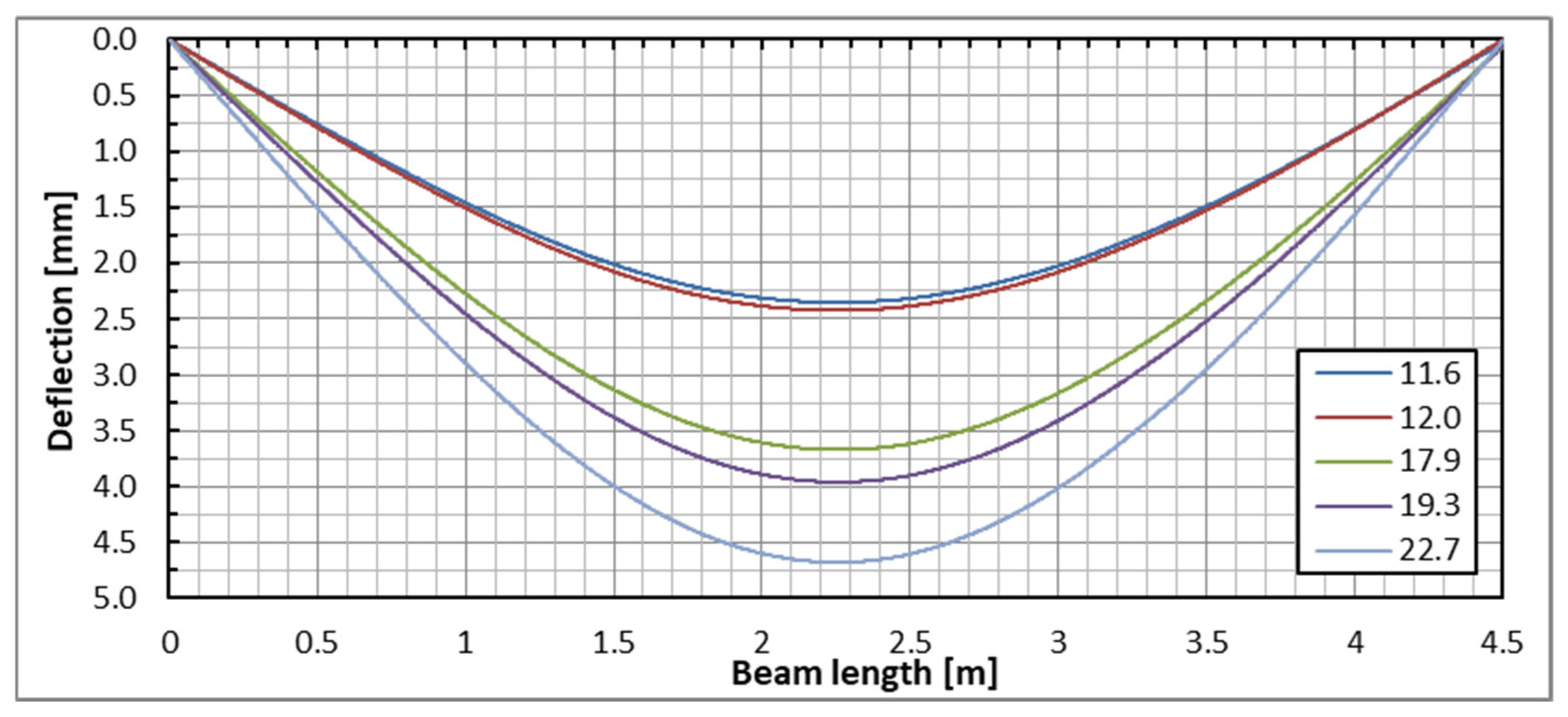 Deflections’ comparison of the exemplary beam determined by three methods for the load up to 22.7 kN.