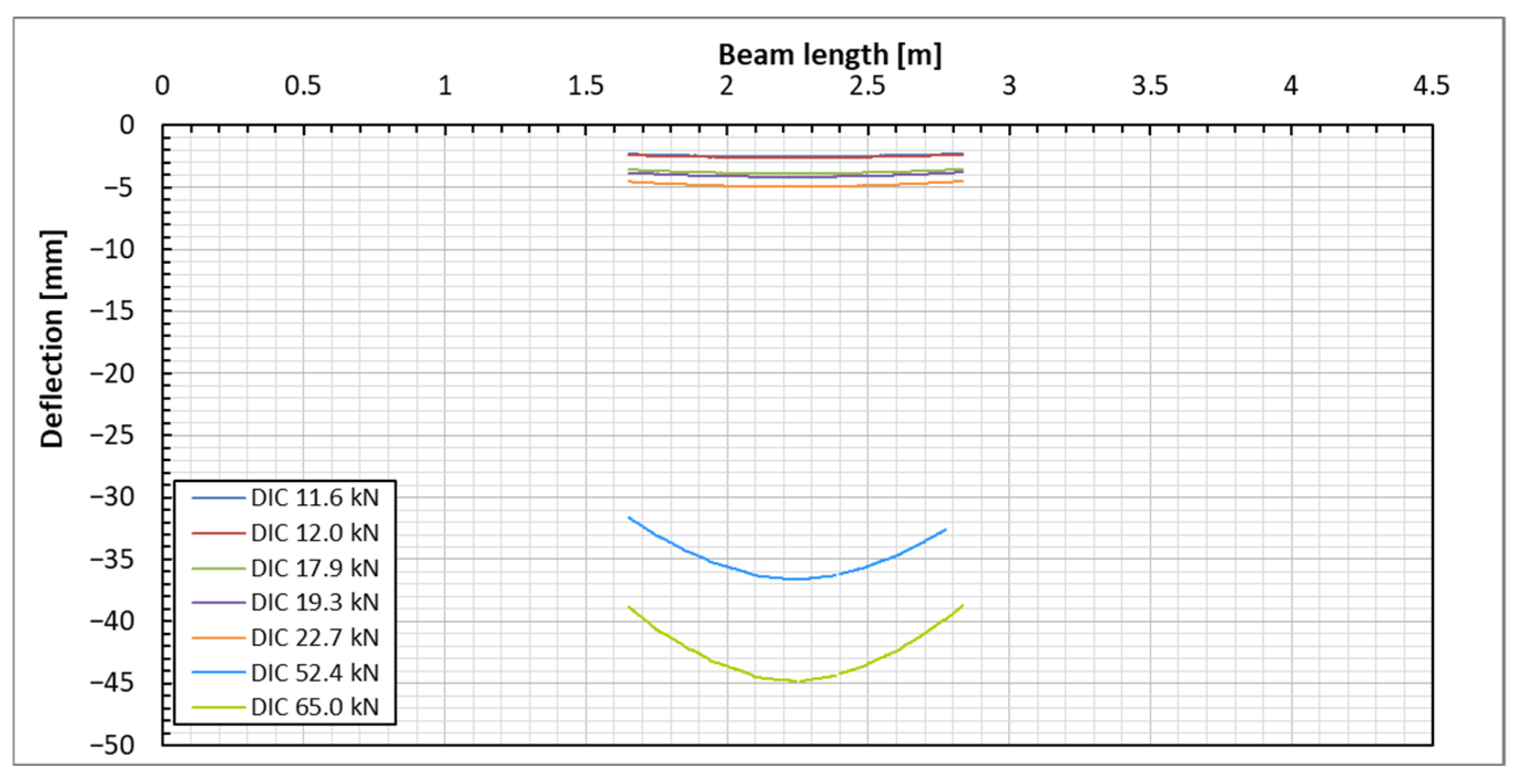 Beam deflection lines under the applied load levels based on the DIC measurement on the beam’s side surface.