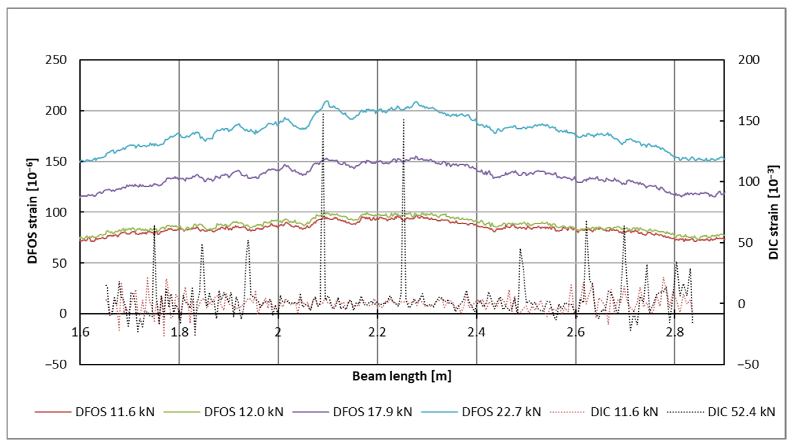 DFOS vs. DIC concrete strains comparison for the bottom zone of an exemplary beam.