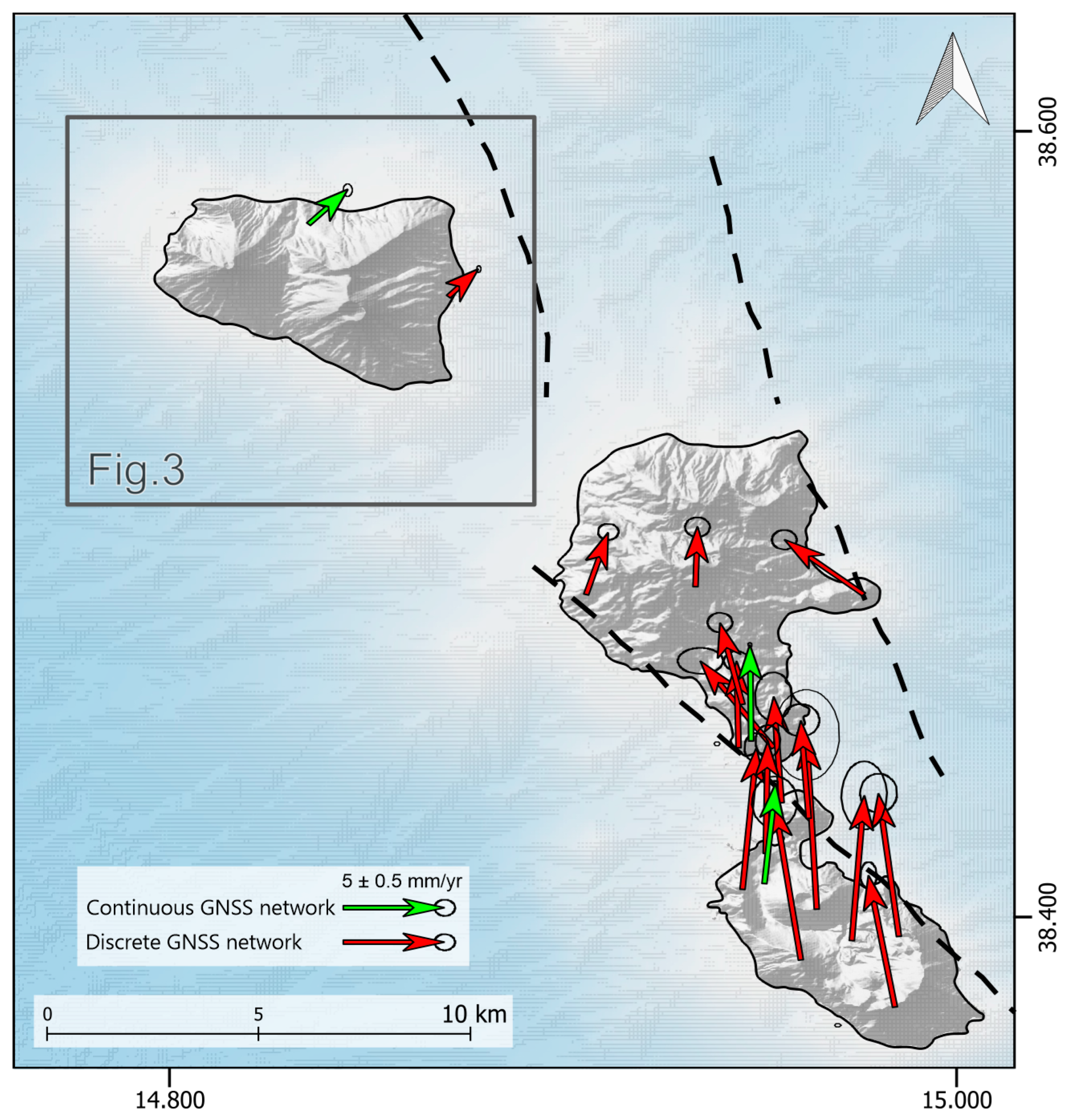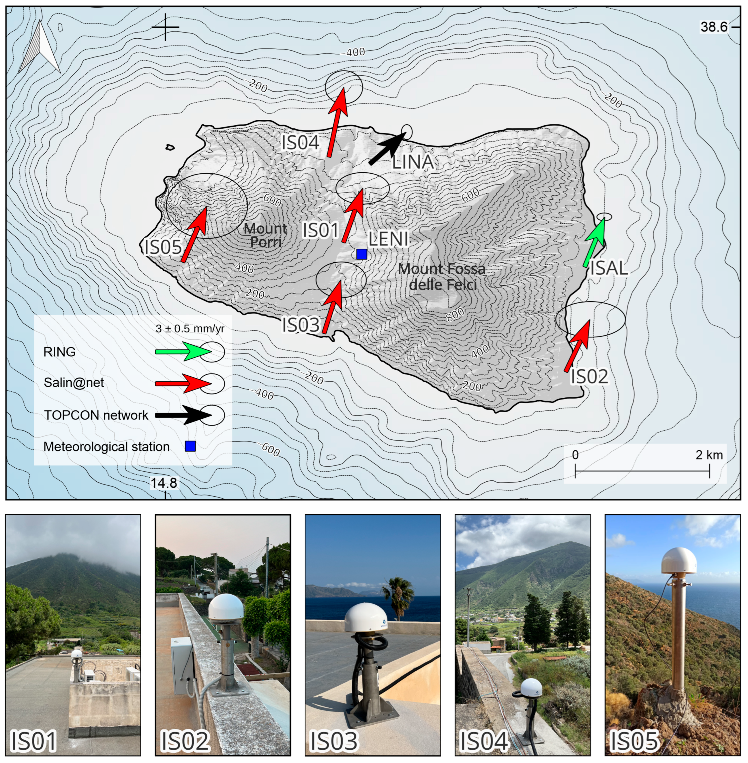- Esposito, A.; Pietrantonio, G.; Bruno, V.; Anzidei, M.; Bonforte, A.; Guglielmino, F.; Mattia, M.; Puglisi, G.; Sepe, V.; Serpelloni, E. Eighteen Years of GPS Surveys in the Aeolian Islands (Southern Italy): Open Data Archive and Velocity Field. Ann. Geophys. 2015, 58, 4. [Google Scholar] [CrossRef]
