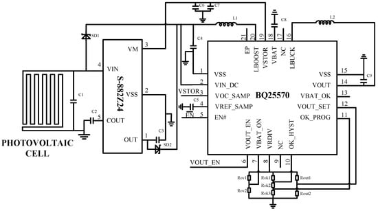 Figure 2 shows the schematic diagram of the circuit module design. Specifically, this circuit centers on the S-882Z24 chip and employs a boost circuit that can initiate operation when the PV cell output voltage drops as low as 300 mV, while maintaining operation at 100 mV through a negative feedback control mechanism. Using the BQ25570 chip with MPPT function, the built-in algorithm dynamically adjusts the load impedance to ensure that the PV cell operates at its maximum power point. A synchronous rectification DC-DC converter is employed to stabilize the input voltage from 0.1 to 5 V to an output voltage of 4.2 V, satisfying the power supply requirements of forest monitoring equipment under specific conditions. This design adopts a low-power chip energy management strategy, which can minimize energy loss through feedback control. It also incorporates overvoltage and undervoltage protection functions to safeguard the energy storage battery and ensure system stability. The physical circuit is shown in Figure 3.