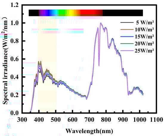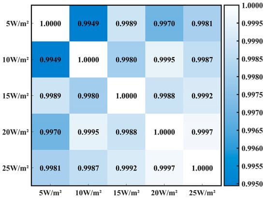 To accurately assess the impact of varying light irradiance levels on the power generation of three types of crystalline silicon PV cells, it is crucial to maintain consistent spectral characteristics of the shaded forest environment throughout the experiment, with light irradiance intensity as the sole variable. To achieve this, the study selected five common arbor forests in northern China and measured spectral characteristics data under five distinct irradiance levels in each forest. The spectral data were normalized. For instance, the normalized spectral characteristics curve for the J. rig forest is depicted in Figure 6. Within the same forest, the spectral characteristic curves under different irradiance levels are essentially identical across most wavelengths, with only the low-wavelength band (400–500 nm) showing slight fluctuations. To ensure the rigor of the experimental results, Pearson correlation coefficients were calculated between spectral data under different irradiance levels within the same forest. Taking the J. rig forest as an example, the Pearson correlation coefficient heatmap is shown in Figure 7. It can be seen that the Pearson correlation coefficients between spectra of the same tree species under different irradiance levels are as high as 0.99 or above, indicating a high degree of correlation. Therefore, it can be concluded that changes in irradiance under the shade of the same tree species do not affect changes in its spectral characteristics.