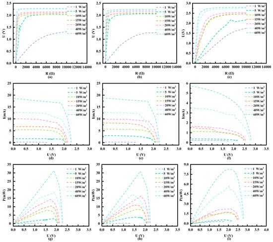 Next, power generation experiments were conducted using the aforementioned three different types of PV cells. The experiment was carried out in a J. rig forest with high tree density in the Beijing area of northern China (39°55′ N, 116°25′ E), which features a typical shaded and diffused light environment. The experiment was conducted at noon on 29 May 2025. To ensure the reliability of the experimental results, while ensuring consistency in test spectra, we measured the output characteristics of PV cells made of three different materials under varying light irradiance in a shaded environment using a multimeter and a variable resistor box. The output characteristic curves are plotted as shown in Figure 8. Due to the constraints of the forest experimental setting, it was challenging to maintain a constant change in irradiance. Therefore, seven sets of typical data were selected based on actual environmental conditions, with irradiances of 1 W/m2, 5 W/m2, 10 W/m2, 15 W/m2, 20 W/m2, 40 W/m2, and 60 W/m2, respectively. The error fluctuation was controlled within ±1 W/m2.