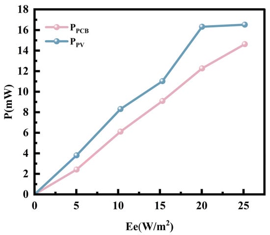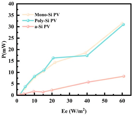 In the shaded forest environment, the power generation performance of PV cells is influenced not only by spectral characteristics but also by light irradiance intensity [24,40]. Variations in light irradiance directly affect the output power of PV cells, thereby impacting the efficiency and stability of the entire PV system [41,42]. Therefore, to comprehensively assess the power generation performance of different types of crystalline silicon PV cells in shaded forest environments, this study further investigates the impact of light irradiance on the power generation of three types of crystalline silicon PV cells.
