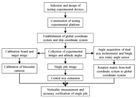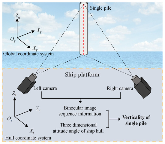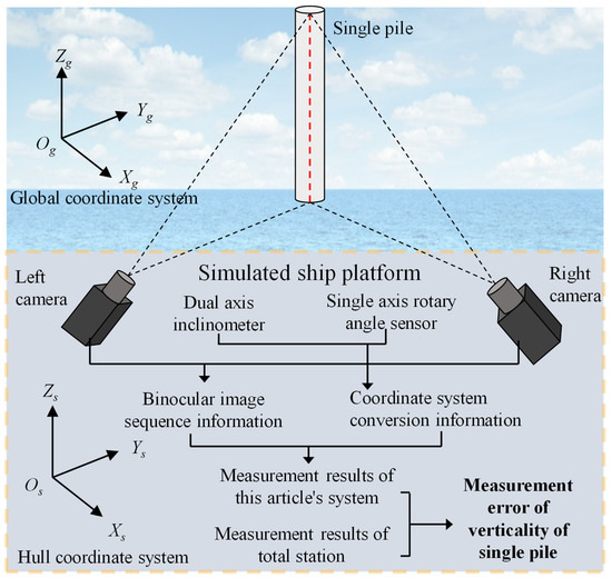 Binocular stereo vision technology is widely used due to its high measurement accuracy, strong real-time performance, low cost, high efficiency, and non-contact measurement advantages [11]. As an emerging application technology, it is crucial to study and analyze its measurement model. In order to clarify the principle of a binocular vision-based method for measuring the verticality of a single pile at sea, this paper starts from the imaging principle of a camera, studies the three-dimensional vector measurement model of a single pile in the ship’s coordinate system and the mapping model from the ship’s coordinate system to the global coordinate system, and derives a measurement model for the verticality of a single pile in the global coordinate system. To verify the correctness of the model, a testing experimental platform was built to simulate the verticality measurement experiment of a single pile on a ship under static and dynamic conditions. Compare the experimental results with the measurement results of the total station to verify the correctness of the measurement model.