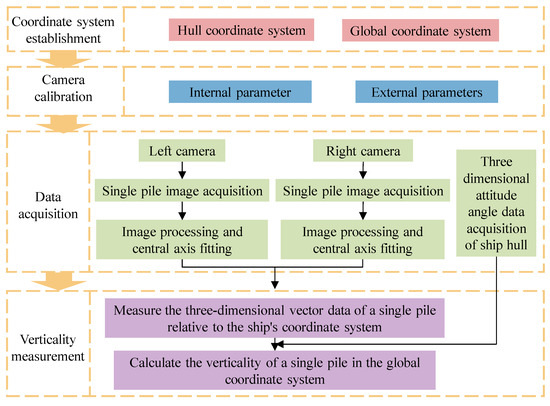 The measurement process includes four stages: coordinate system establishment, camera calibration, data acquisition, and verticality measurement. The measurement process is shown in Figure 2.