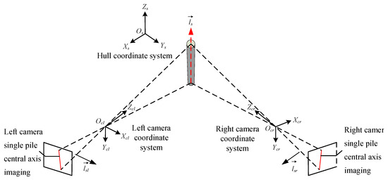 The normal vectors of the plane formed by the imaging of the single-pile axis and the left and right camera pixels in the hull coordinate system are and , respectively. Therefore, the expression of the three-dimensional vector of the single-pile axis in the hull coordinate system is