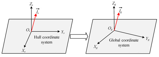 The three-dimensional vector measured in the hull coordinate system is converted to the global coordinate system as follows: