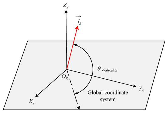 In the formula , respectively represent the components of the three-dimensional vector on the , , and axes of the global coordinate system. Therefore, the verticality q of a single pile is shown in Equation (8), and the schematic diagram of the verticality of a single pile is shown in Figure 7.