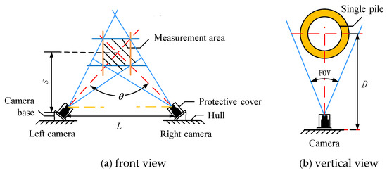 In order to investigate the effect of the optical axis angle between binocular cameras on the verticality measurement of a single pile, assuming that the hull coordinate system is consistent with the global coordinate system, an ideal binocular camera model is established for analysis, as shown in Figure 9. Assuming there is an error in the single axis obtained from the image of the left camera, and no error in the single axis obtained from the image of the right camera, the optical axis of the left camera intersects with the central axis of the single pile, and the optical center of the right camera forms a plane parallel to the plane with the central axis of the single pile [17].