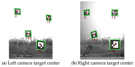 The center points of the four sets of ArUco code targets extracted by the left and right cameras are shown in Figure 16. The three-dimensional point coordinates and pixel information of the target center point extracted by the left and right cameras are shown in Table 3 and Table 4, respectively.