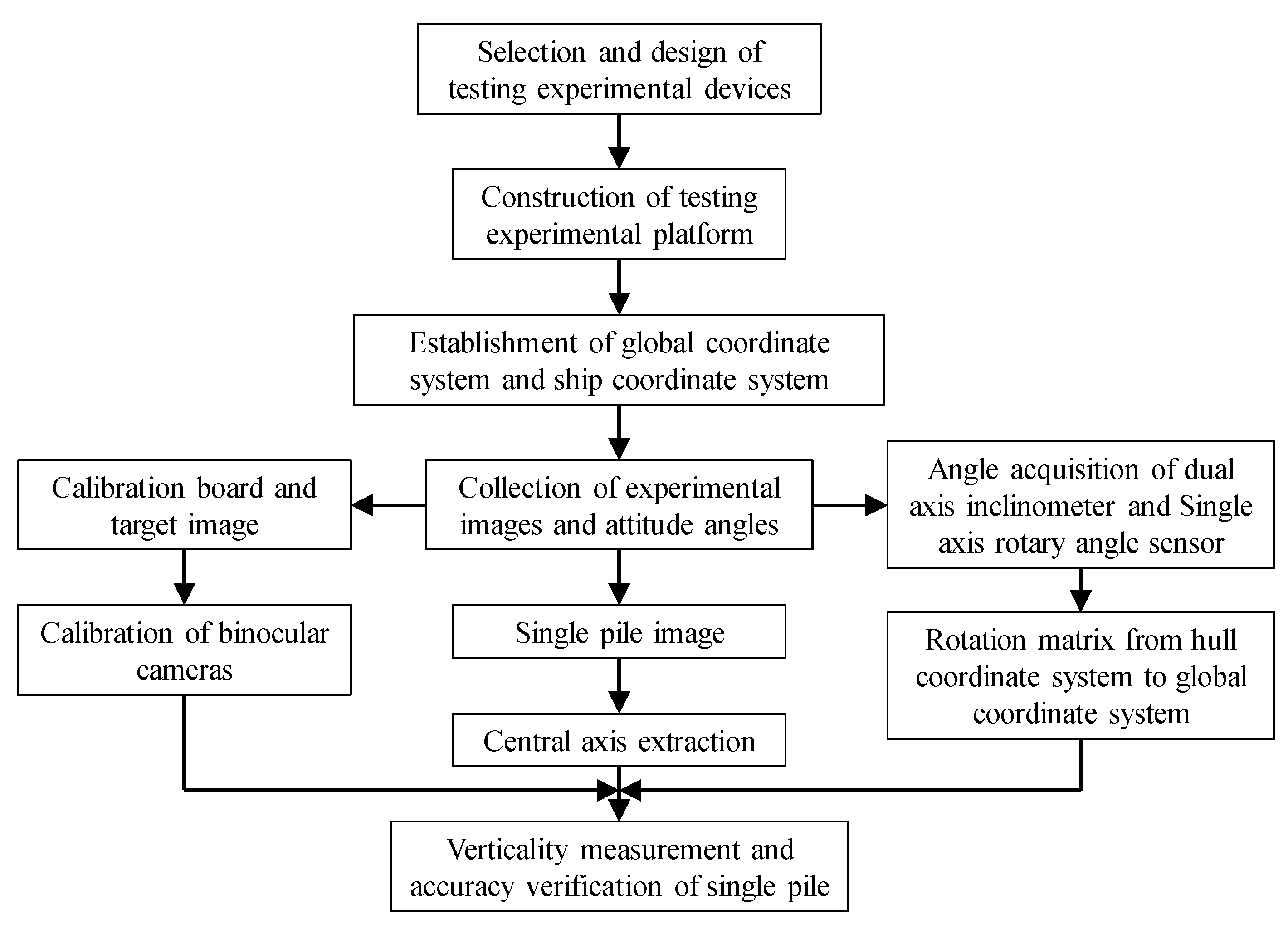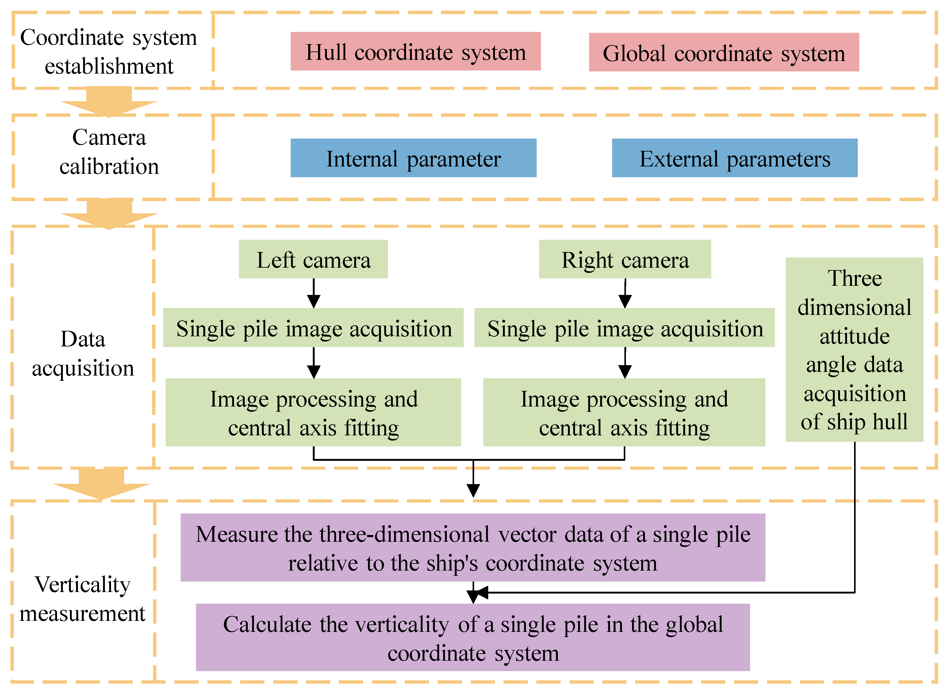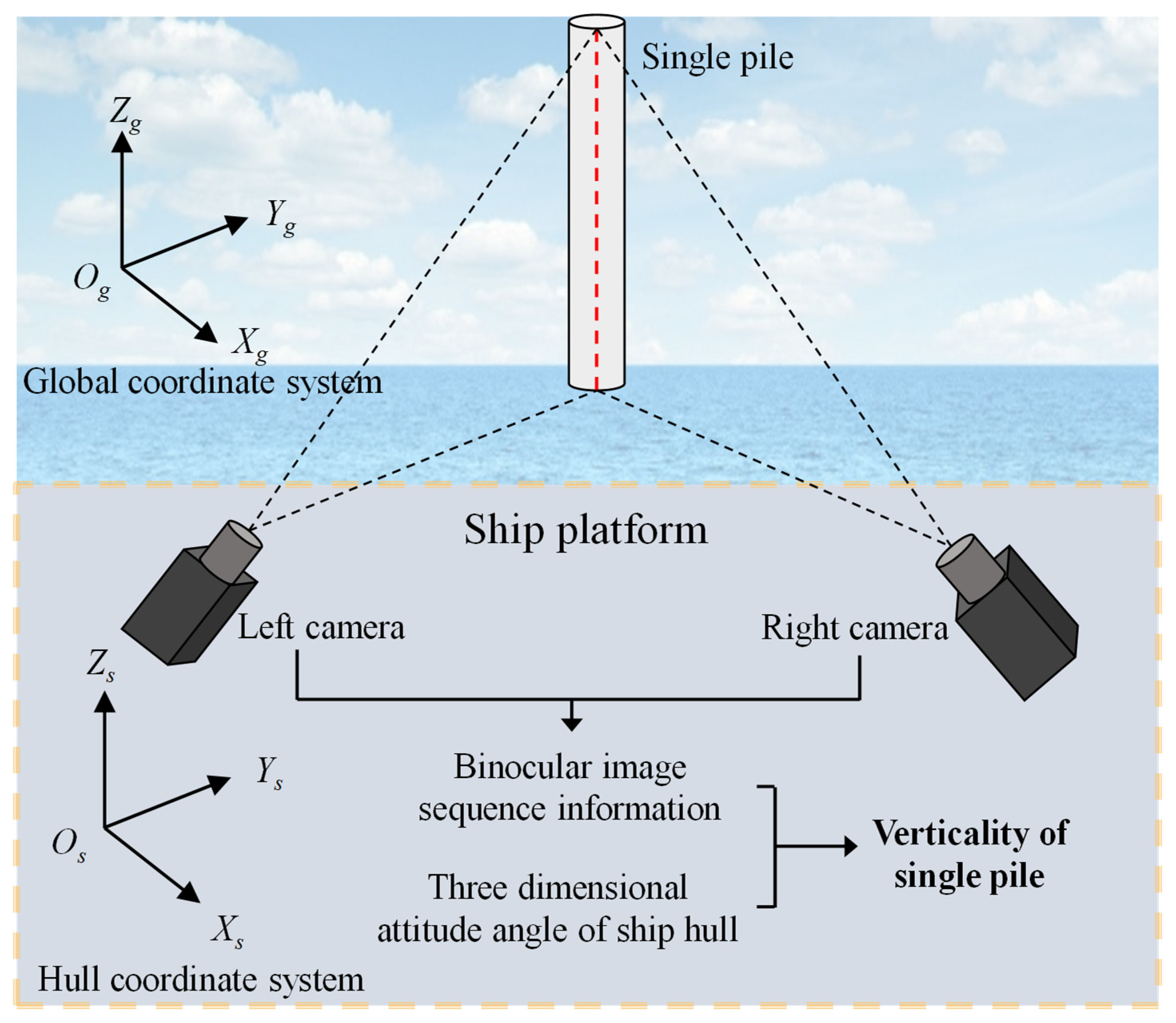 A deep understanding of the imaging model of monocular cameras is the foundation for exploring the principles of binocular vision imaging. By analyzing the binocular vision imaging model in the hull coordinate system, the three-dimensional vector of a single pile can be determined. Establishing a mapping model from the hull coordinate system to the global coordinate system, combined with the three-dimensional attitude angle of the ship itself, can map the three-dimensional vector information of a single pile in the hull coordinate system to the global coordinate system, thereby obtaining the verticality data of the single pile.