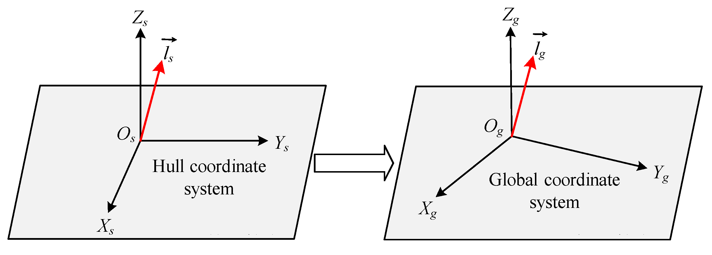 from the hull coordinate system to the global coordinate system is
