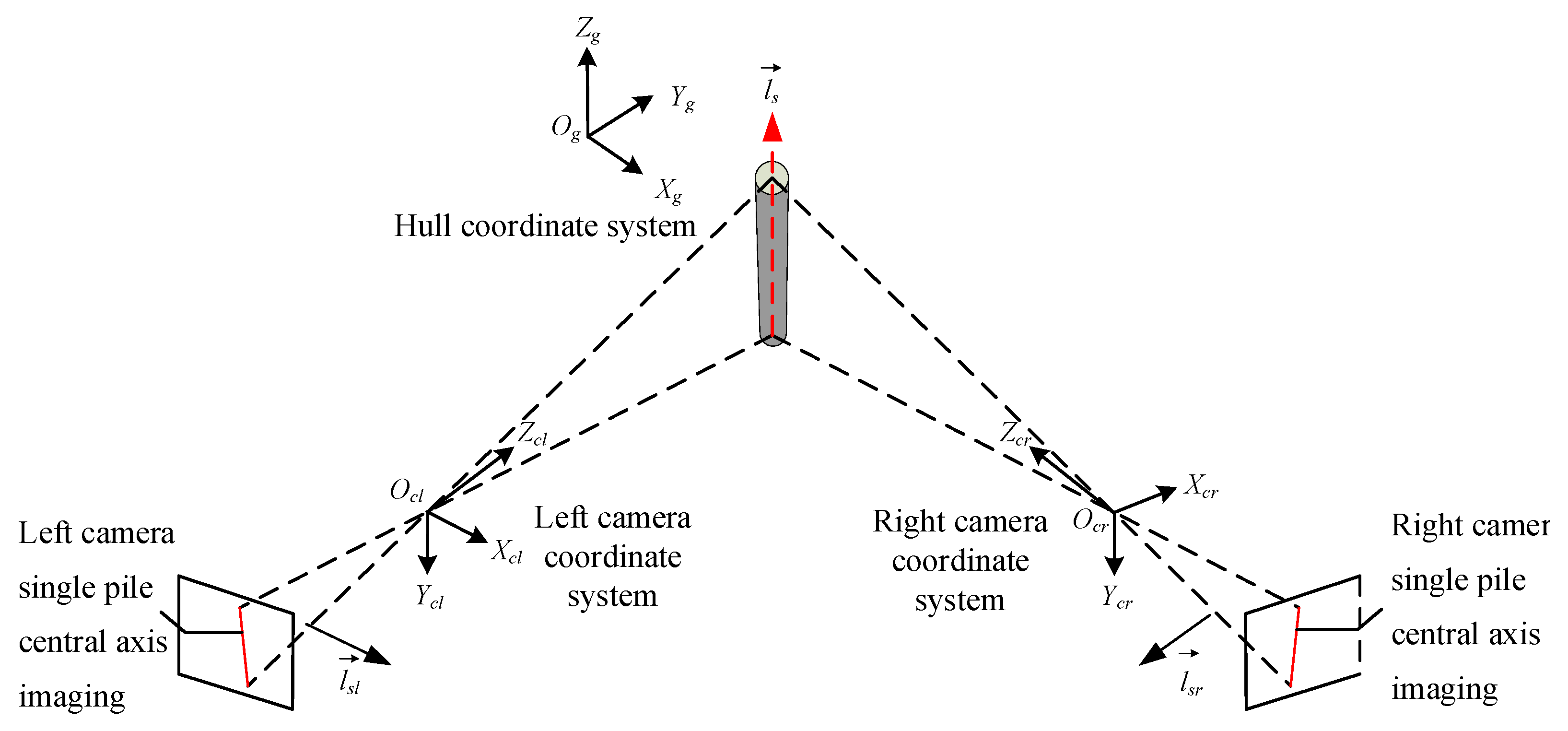 Based on binocular vision imaging technology, the three-dimensional vector of a single pile relative to the ship’s coordinate system is measured. The specific solving process is divided into two steps: first, the normal vector of the object image plane along the axis of the single pile in the ship’s coordinate system is solved. Then, the two normal vectors solved are cross-multiplied to obtain the three-dimensional vector of the single pile in the ship’s coordinate system.