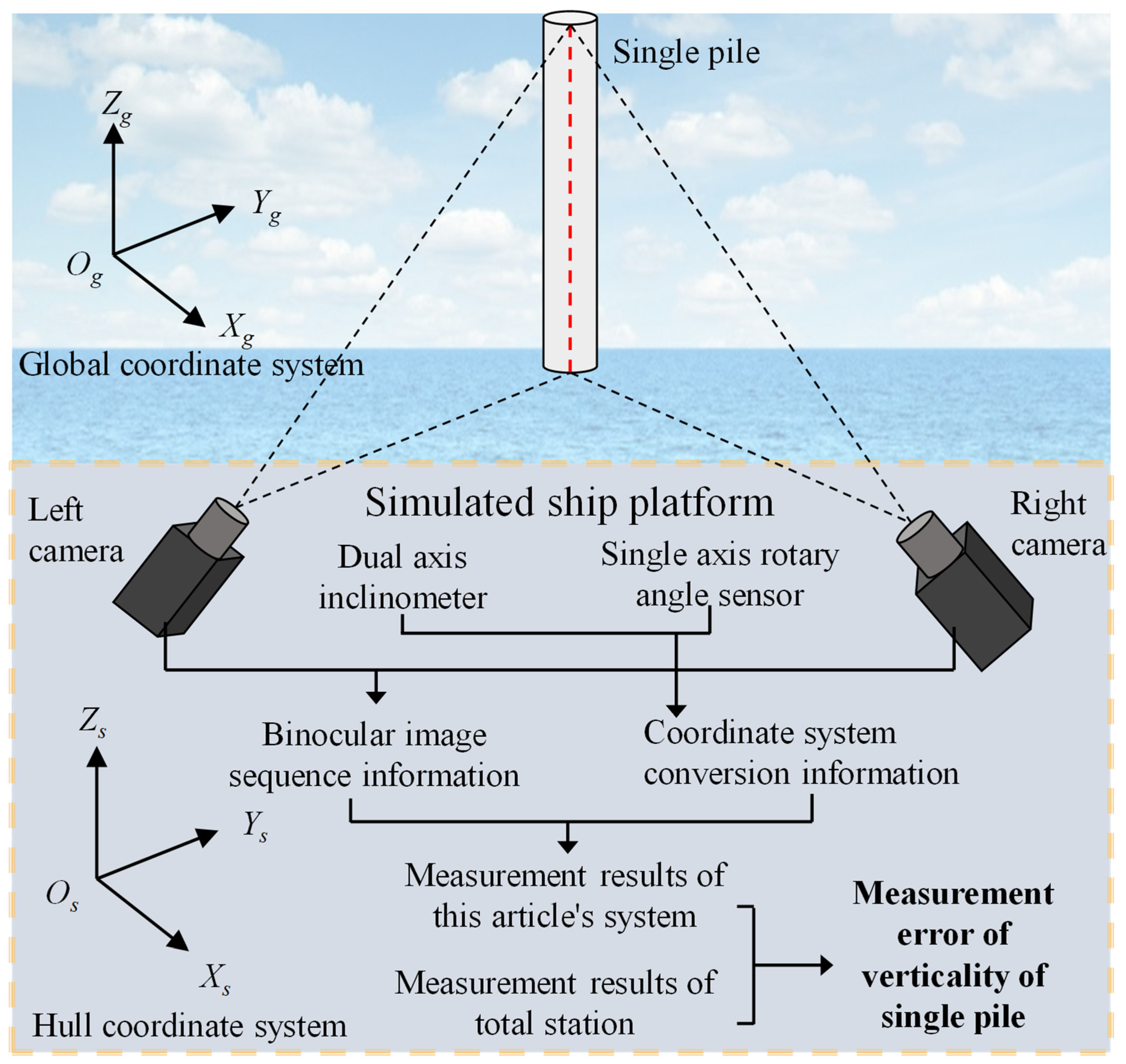 11]. As an emerging application technology, it is crucial to study and analyze its measurement model. In order to clarify the principle of a binocular vision-based method for measuring the verticality of a single pile at sea, this paper starts from the imaging principle of a camera, studies the three-dimensional vector measurement model of a single pile in the ship’s coordinate system and the mapping model from the ship’s coordinate system to the global coordinate system, and derives a measurement model for the verticality of a single pile in the global coordinate system. To verify the correctness of the model, a testing experimental platform was built to simulate the verticality measurement experiment of a single pile on a ship under static and dynamic conditions. Compare the experimental results with the measurement results of the total station to verify the correctness of the measurement model.