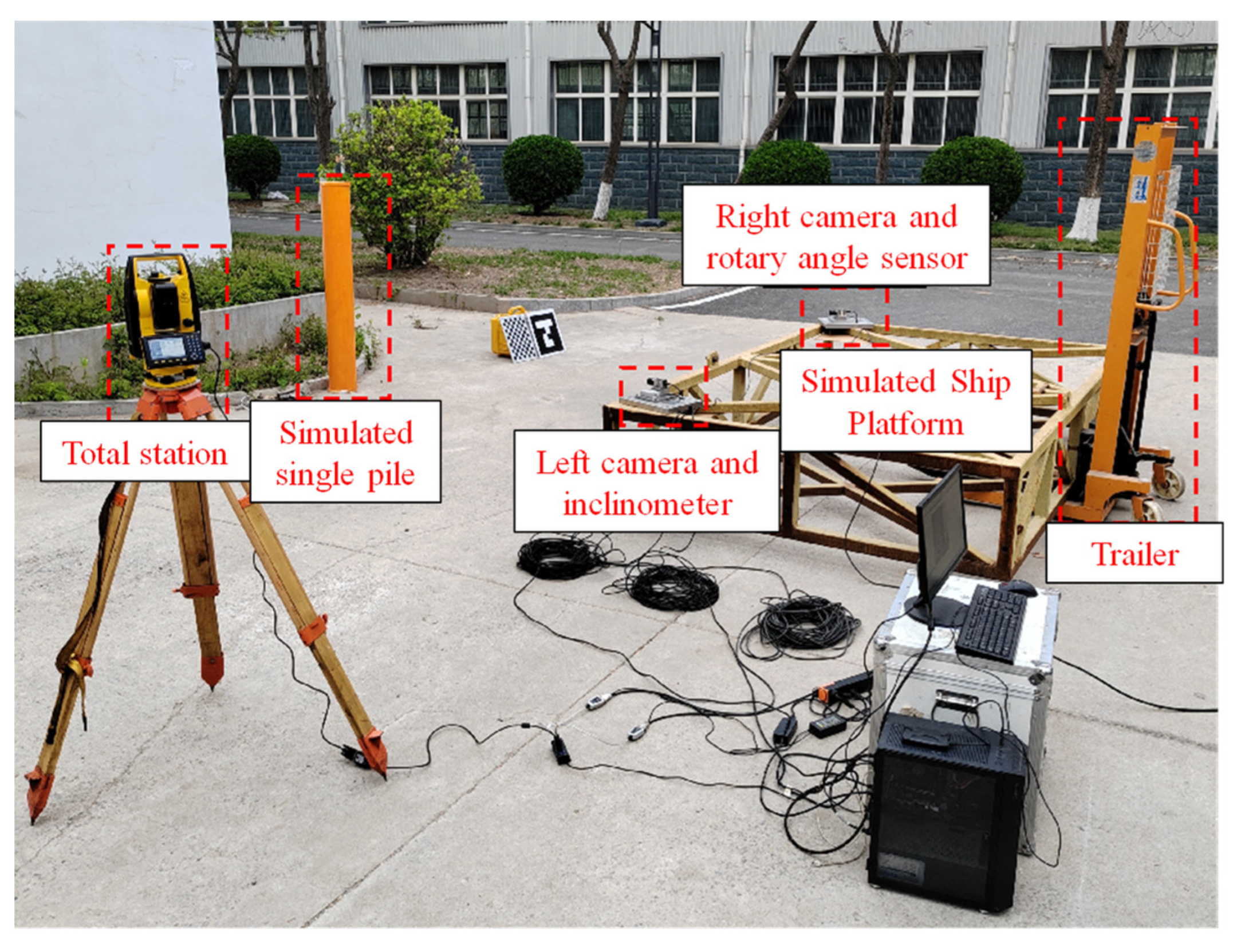 Due to the limitations of simulating ship structures, the distance between the two cameras is approximately 3 m. The cameras are fixed to the simulated ship and placed on the side of the simulated ship near the single pile. The angle between the optical axes of the two cameras is adjusted to be close to orthogonal, and the simulated single pile is ensured to be located at the intersection center of the binocular camera field of view.