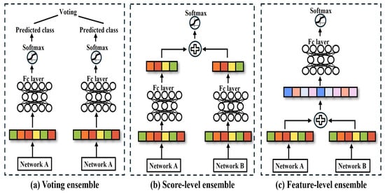 Islam et al. [6] recognized emotions through feature extraction algorithms such as HOG and LBP and SVM, a representative machine learning model for the initial FER system. Unlike the deep learning network methods, the HOG and LBP feature extraction methods extract handcrafted features by separating the feature extraction step from the classification step; but, the accuracy of emotion classification was verified to be low due to the limitation of learning high-dimensional nonlinear patterns. With the development of deep learning networks, Krizhevsky et al. [7], who used convolutional neural networks (CNNs), verified the effectiveness of high-dimensional nonlinear pattern analysis through filter-based convolution operations. Ravi et al. [8] verified the superiority of a CNN by comparing and analyzing two methods, LBP and CNN, on the same FER database. CNN-based networks extracting local features face limitations due to the inductive bias of local connectivity and spatial invariance. It is difficult to consider the correlation of local features such as eyes and mouths in the feature extraction process of facial images using CNN-based networks. The vision transformer (ViT) proposed by Dosovitskiy et al. [9] solved the limitations of CNNs by obtaining correlation information between each patch through an attention block of a linearly projected image in patch units and using global features of expressions. Chaudhari et al. [10] verified that ViT had higher a accuracy than CNN in FER. CNN and ViT are easily overfitted to the training DB when designed as a single network, making it difficult to improve classification accuracy with high sensitivity in real-world environments. To address the limited performance of a single network, Xu et al. [11] proposed a voting ensemble method, Singh et al. [12] developed a score-level ensemble method, and Karnati et al. [13] proposed a feature-level ensemble method. Existing ensemble networks’ performances are determined by a single network, so important information exchange between the networks is insufficient and the feature information of each network is lost during the ensemble process.