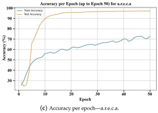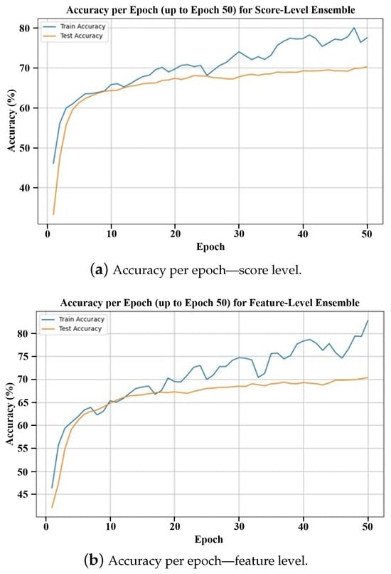 Figure 5 is a graph comparing the accuracy of the score-level ensemble and feature-level ensemble methods and the proposed ArecaNet during 50 epochs of training and testing on the FER-2013 DB. The experiment in Figure 5 was conducted to measure how many training processes are needed for high emotion recognition accuracy in the test environment. The emotion recognition accuracy was evaluated using the training and test datasets for each epoch. In Figure 5a,b, the score-level and feature-level ensembles show the accuracy improvement limit and overfitting phenomenon as the accuracy converges to 70.2% and 70.35%, respectively, in the test environment during 50 epochs. ArecaNet achieves a 65.56% test accuracy after only 5 epochs of training and 89.57% after 10 epochs in Figure 5c. ArecaNet performed pattern recognition for emotion recognition more accurately and efficiently with less training time than existing ensemble methods such as score-level and feature-level. Some signs of overfitting appear in ArecaNet. While the score-level ensemble and feature-level ensemble converge at around 70% in test accuracy, ArecaNet is analyzed as having an additional accuracy performance improvement even after the accuracy converges at around 95%. Since the test accuracy at the convergence point is different, ArecaNet cannot be interpreted as having the same level of overfitting as the score-level and feature-level ensembles. The test accuracy of over 90% in 10 epochs in ArecaNet is achieved due to its high generalization performance.