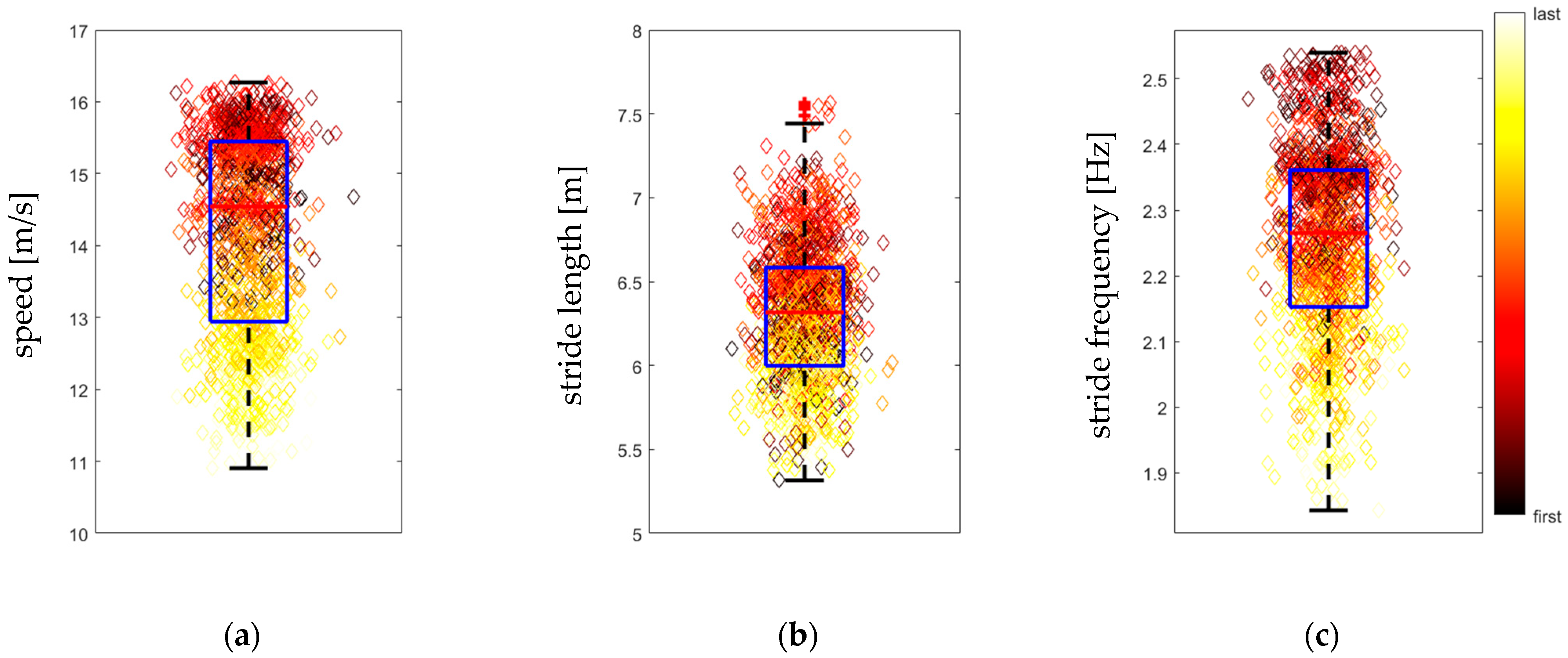 Figure 2. Median (first and third quartile) speed, stride length and stride frequency were 14.5 (12.9, 15.4) m/s, 6.32 (6.00, 6.58) m, and 2.265 (2.153, 2.361) Hz, respectively.