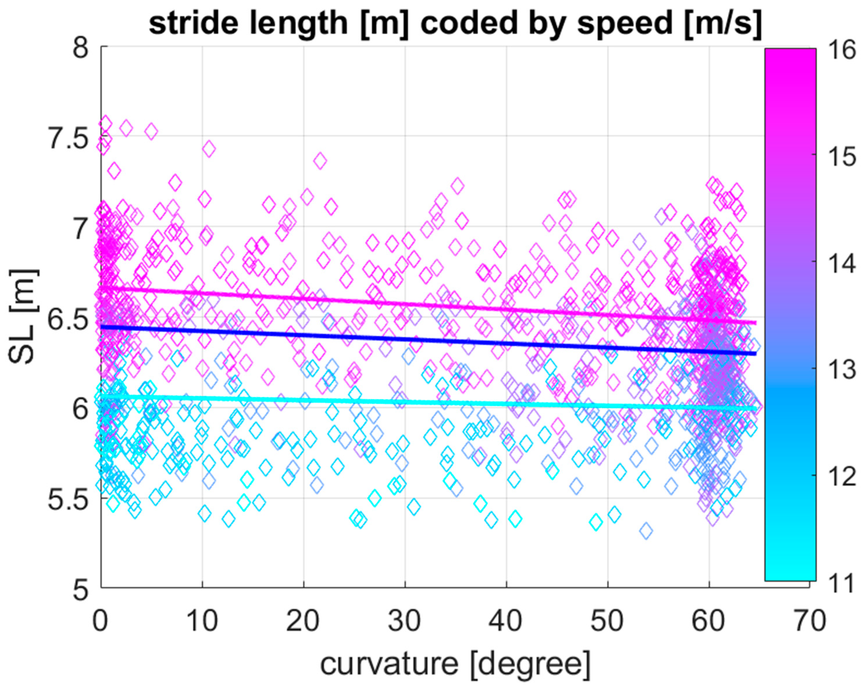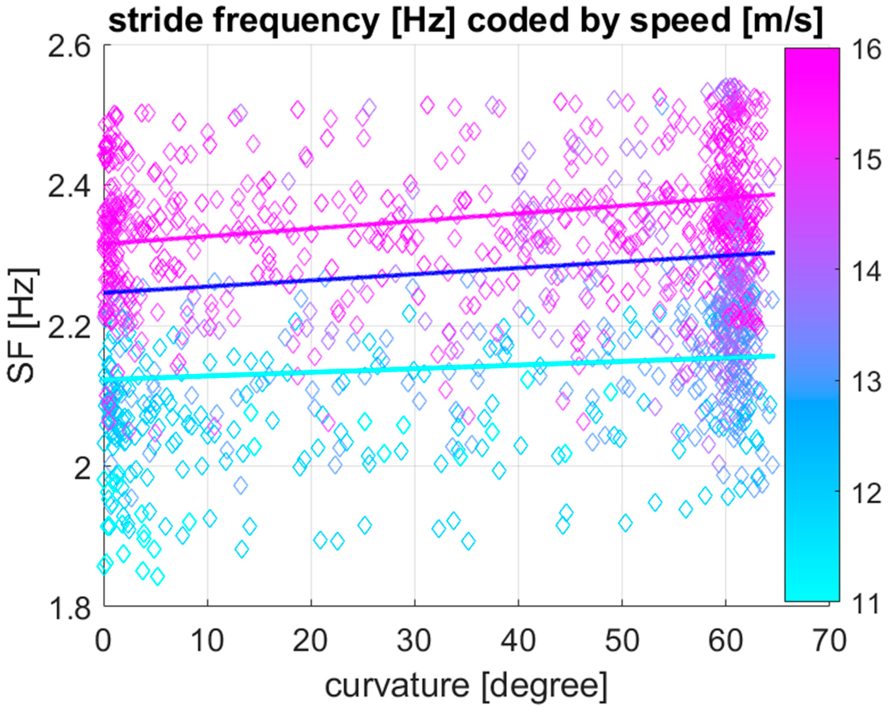 Figure 4 illustrate trends in stride parameters for different speeds. As expected, both stride length and stride frequency increase with increasing speed. Stride length decreases in the curve compared to the straight, but the amount is dependent on the speed: at a speed of 12.9 m/s, stride length decreases with 1.04 mm per degree of curvature, while at 15.4 m/s it decreases with 2.99 mm per degree of curvature, i.e., more than twice the decrease at the higher speed. Similarly, stride frequency increases in the curve with 5.2 × 10