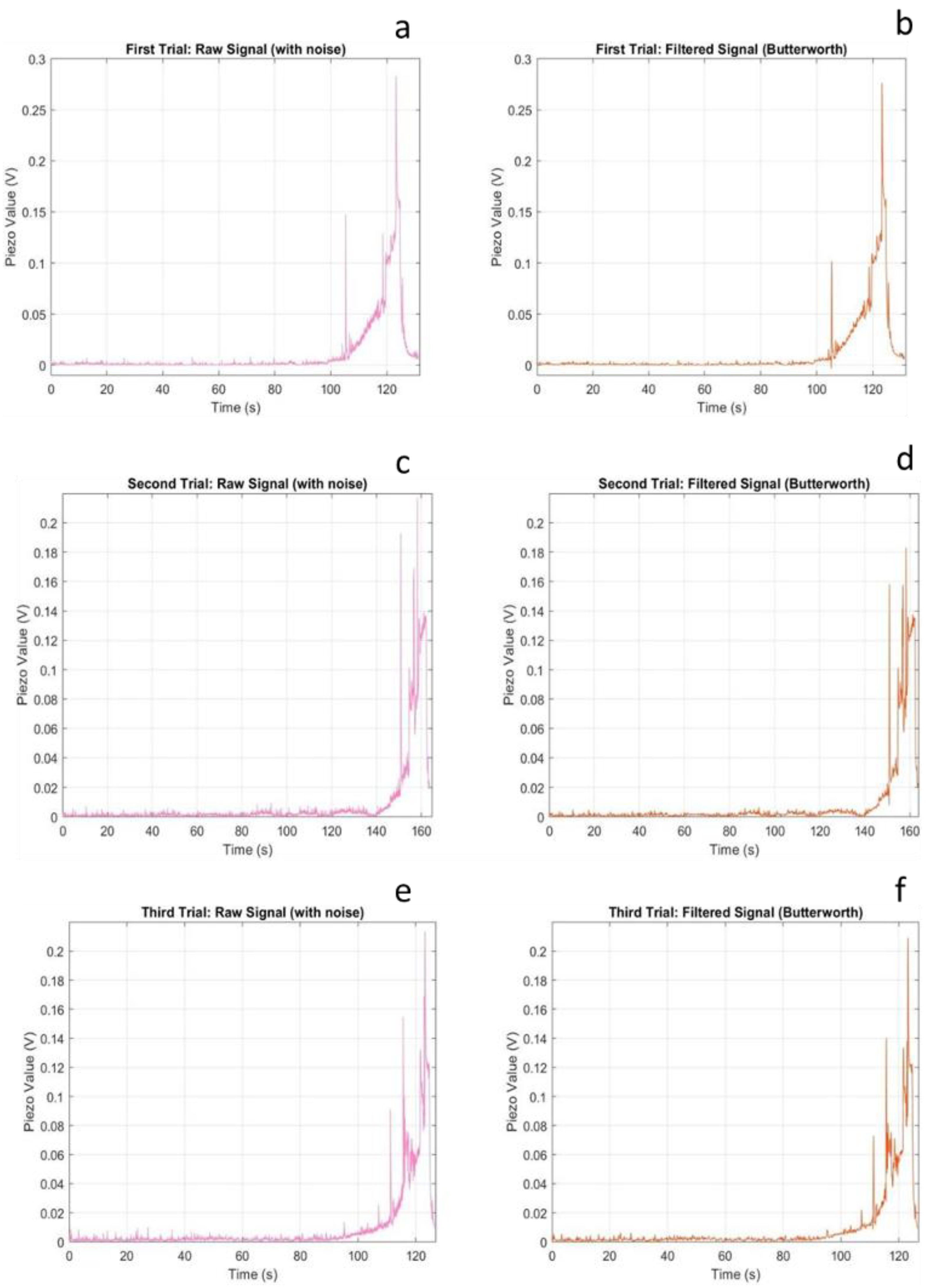 Figure 9 presents the filtered voltage signal from the piezoelectric sensor (left