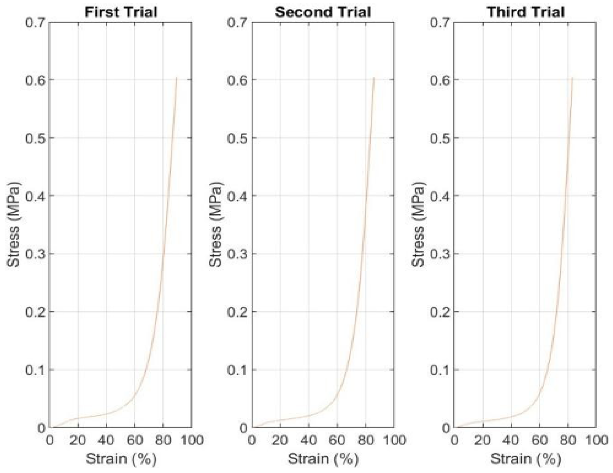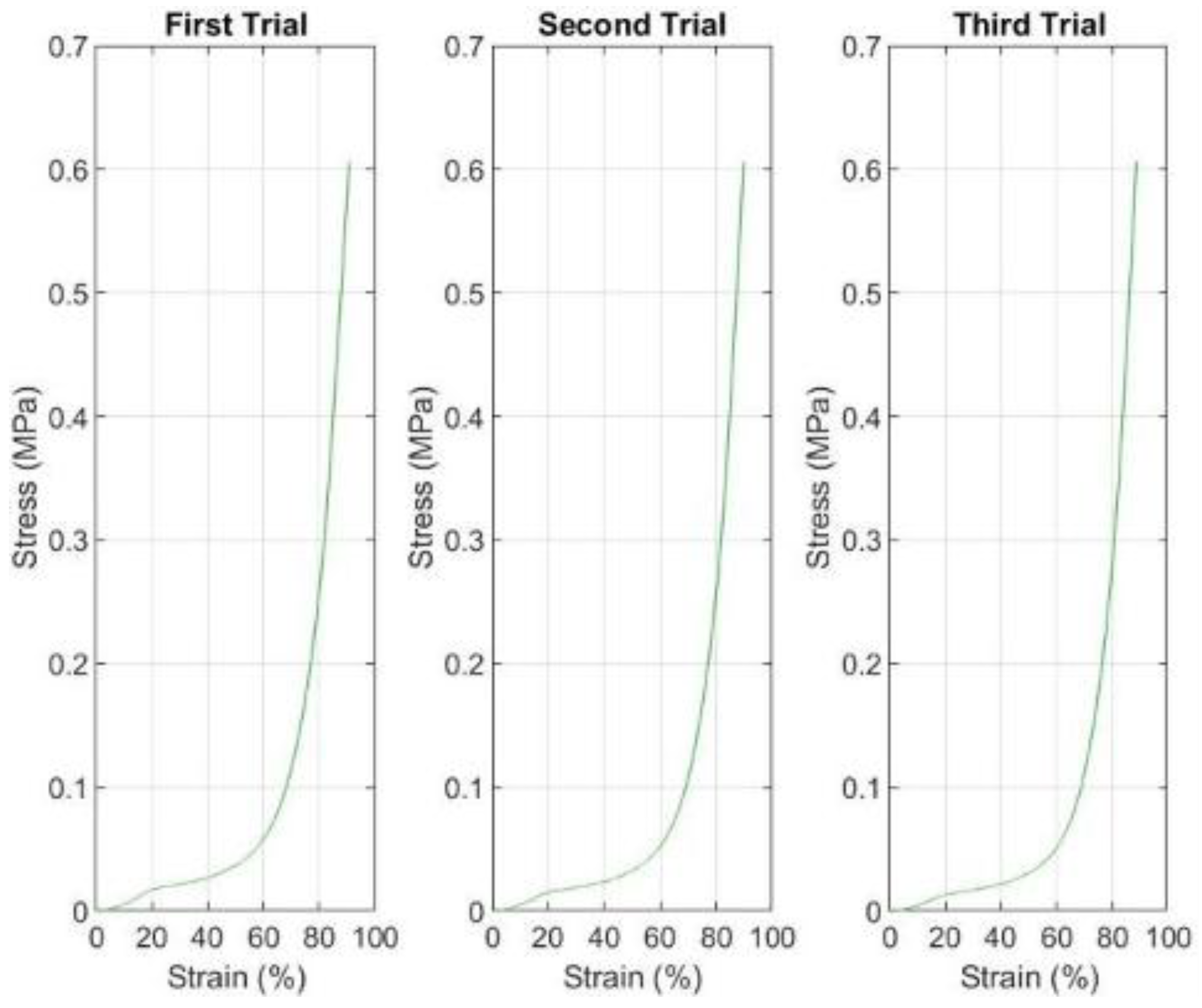 Figure 6 presents the stress-strain curves for the FSR-equipped prototype across three compression trials. The curves exhibit characteristic behavior of closed-cell foam materials commonly used in footwear applications: an initial low-modulus region where cell walls bend and buckle, followed by a transition to higher stiffness as cells collapse and material densification occurs.