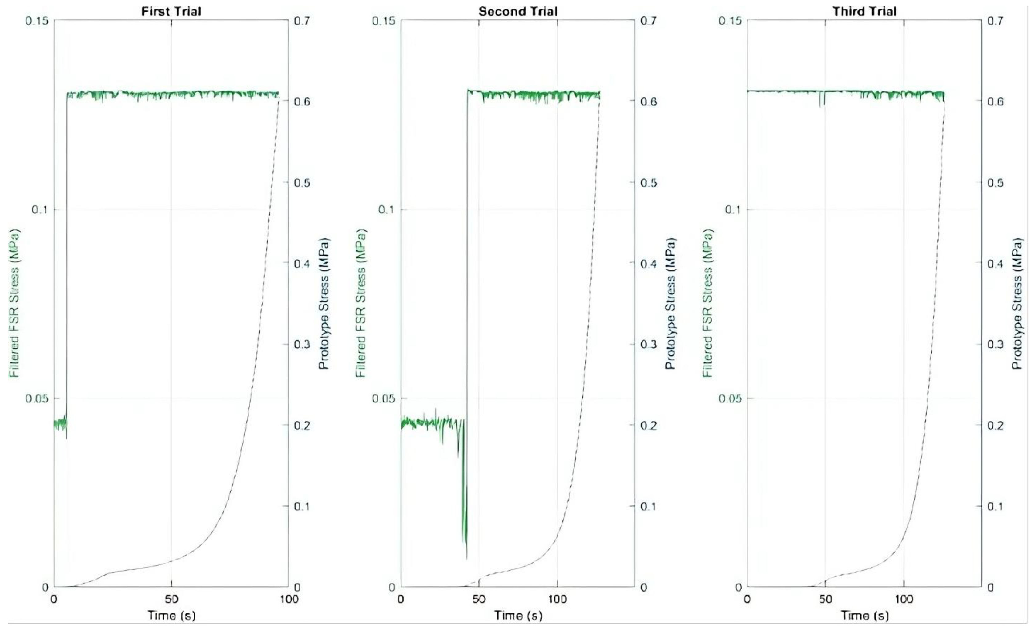 The initial portion of each curve demonstrates a consistent increase, indicating that the sensor responds coherently to the onset of material deformation. In each trial, however, the FSR signal reaches its saturation limit relatively quickly, while the mechanical stress continues to increase. This saturation is consistent across trials and reflects the known limitation of FSR, which provide reliable measurements only within a limited load range (approximately 0.2 to 20 N). Beyond this range, the sensor output stabilizes and does not reflect further increases in mechanical stress.