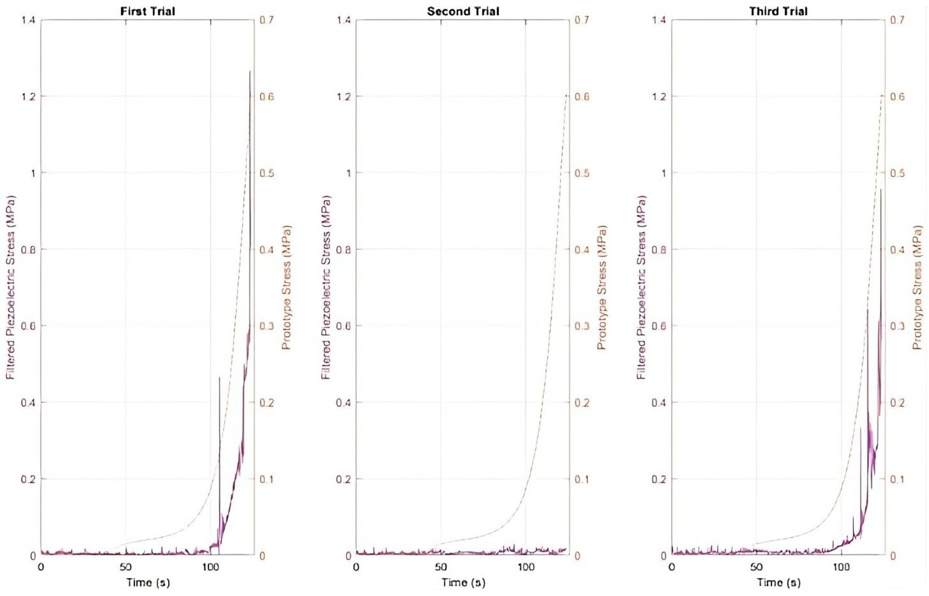 Mechanical stress increases progressively and steadily throughout each trial, while the piezoelectric signal exhibits sharp, well-defined peaks that appear abruptly and briefly. This pattern reflects the sensor’s sensitivity to sudden changes in load rather than to sustained force.