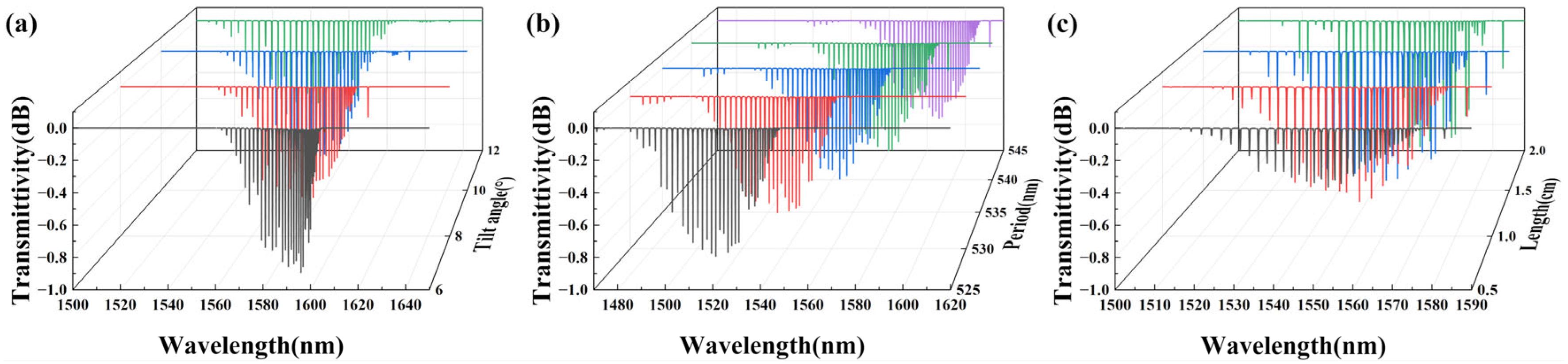 - The TFBG length was set to 0.5 cm, 1 cm, 1.5 cm, and 2 cm. The TFBG tilt angle and period were set to 8° and 535 nm. The simulated transmission spectra of different lengths are shown in Figure 2c. As the grating length increases, the transmission depth increases. However, an excessively long grating length can compromise the mechanical strength of the optical fiber. To balance mechanical strength and transmission depth, we selected a grating length of 1 cm, ensuring both high mechanical strength and a deep transmission spectrum.