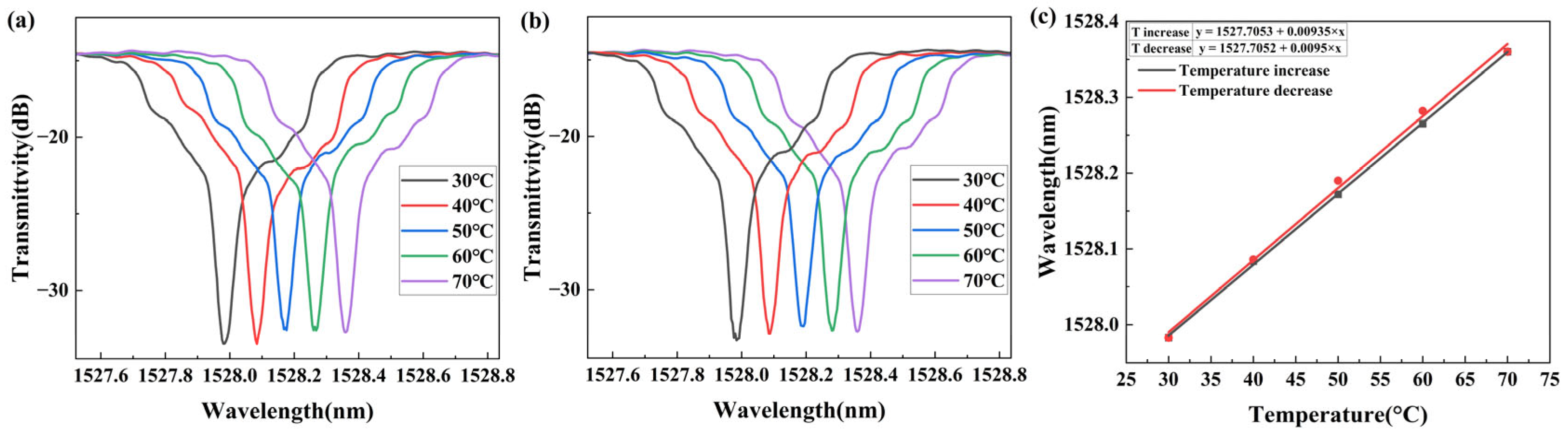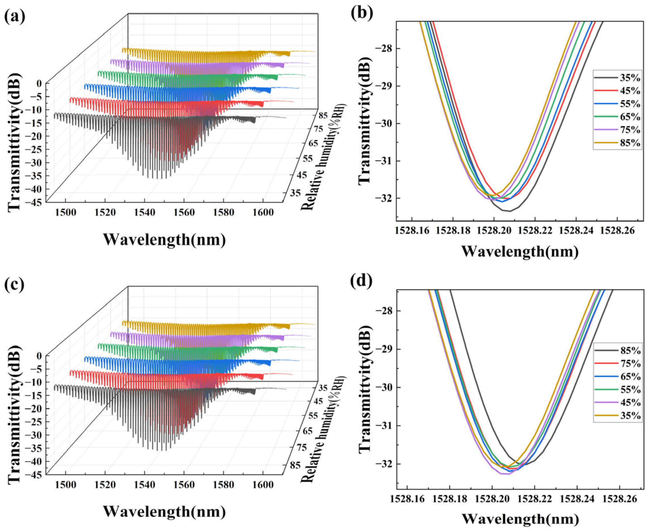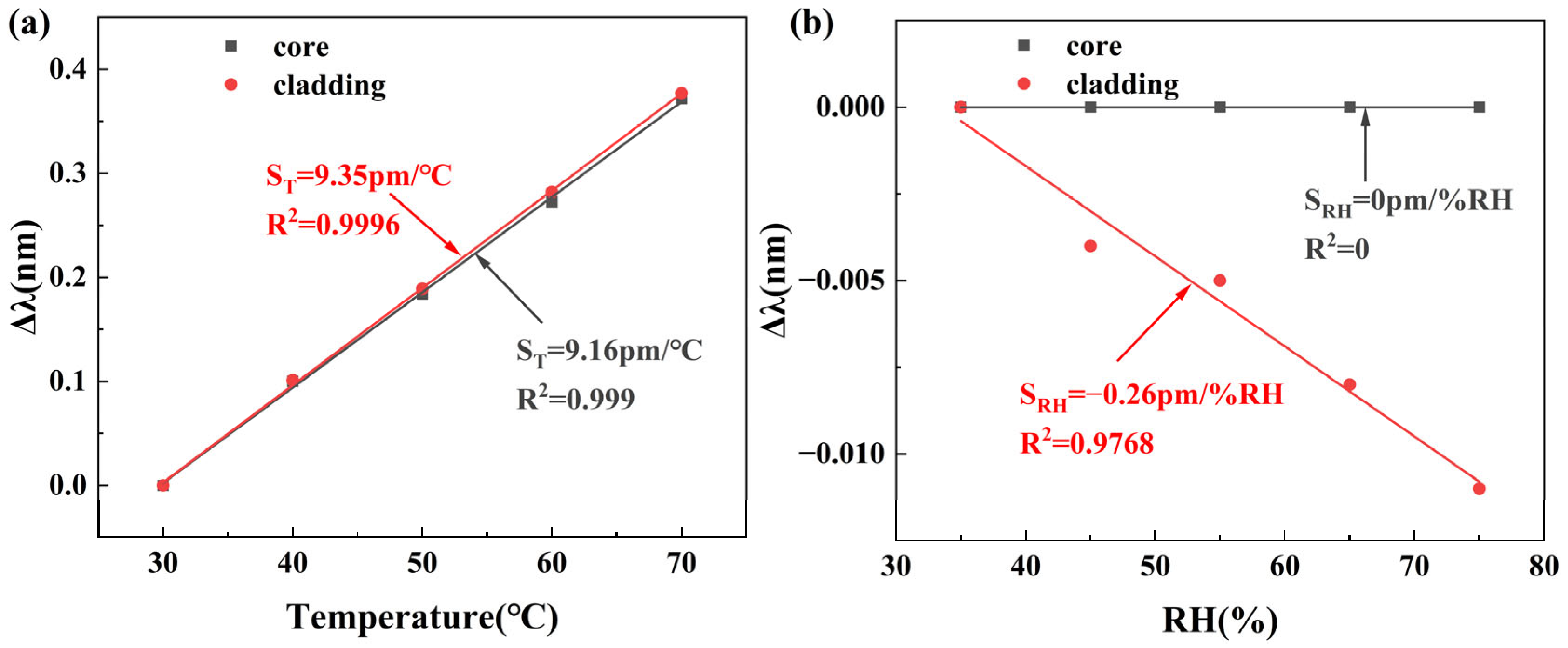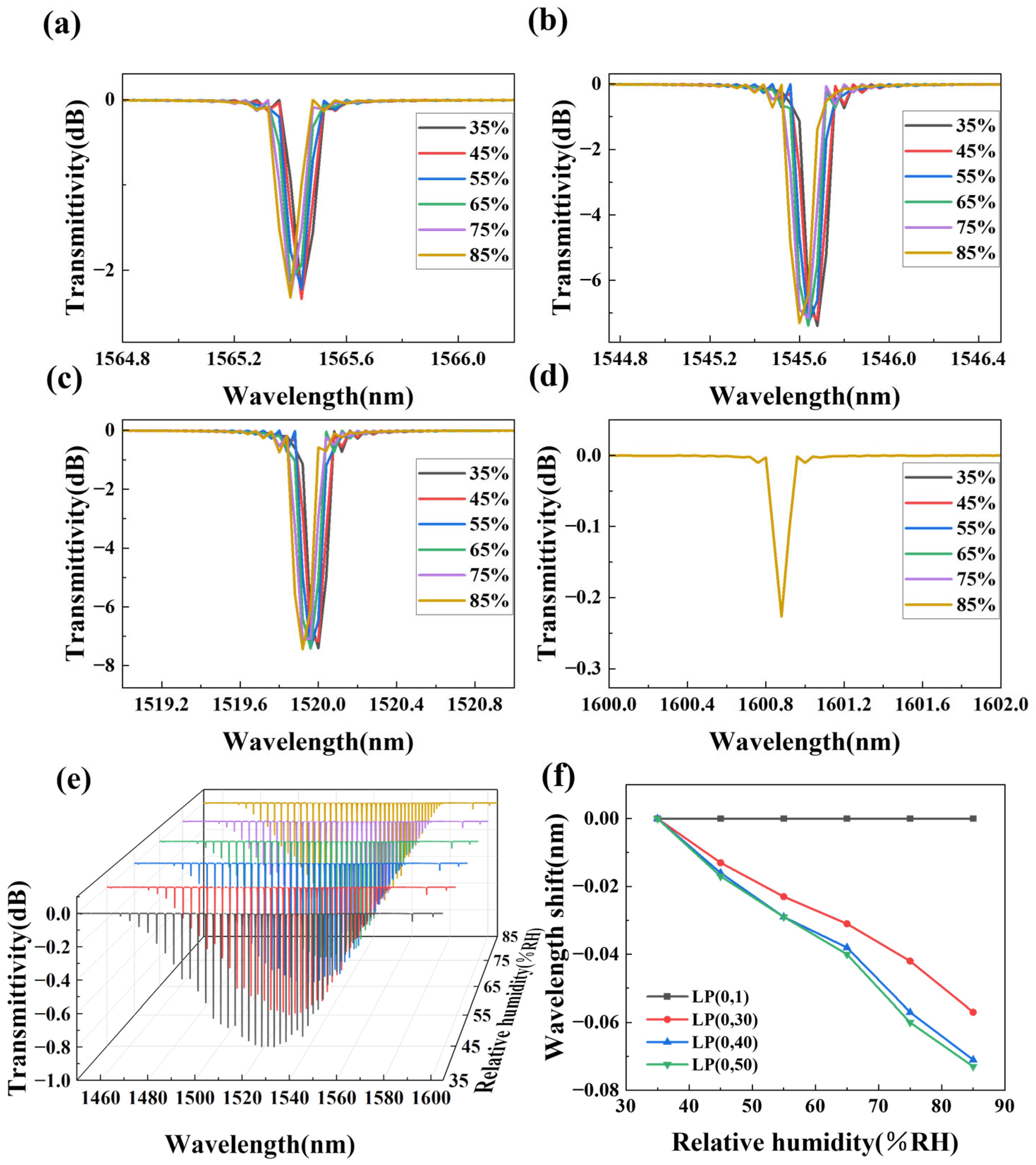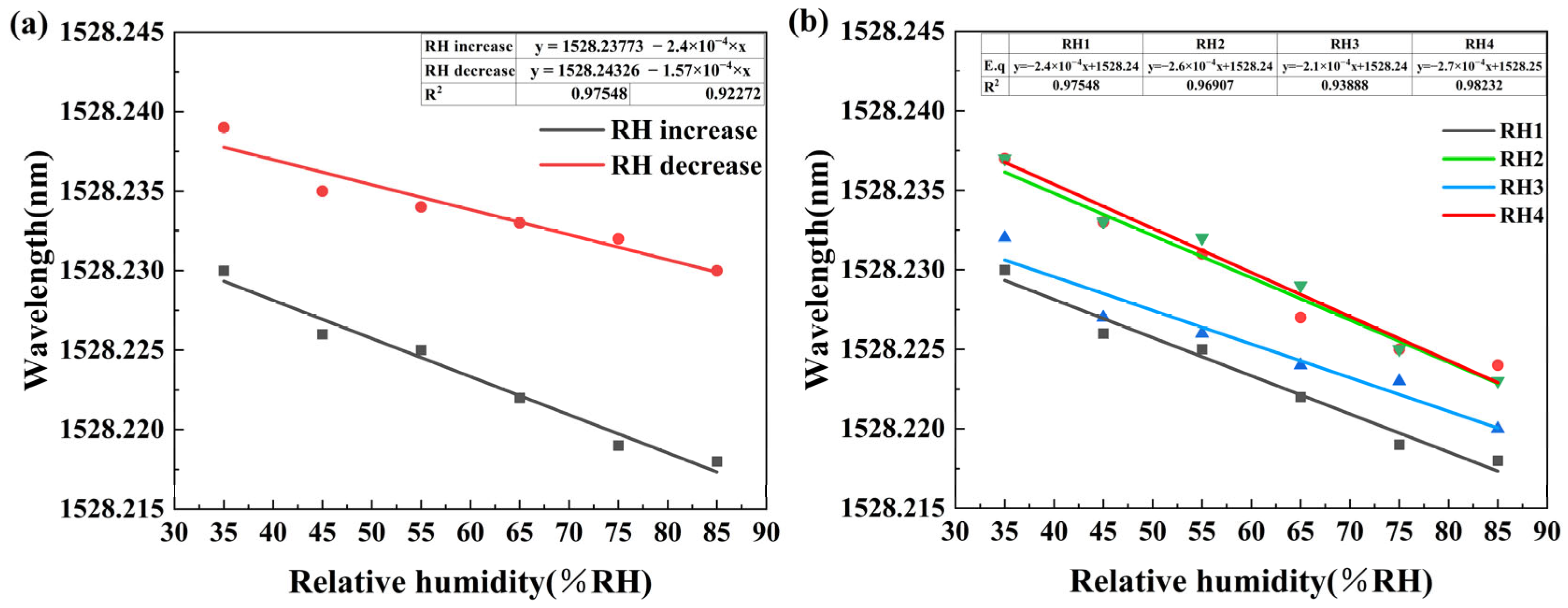 - Ren, K.; Jia, A.; Hu, J.; Li, G.; Wang, W.; Li, M.; Han, D.; Zheng, Y.; Li, J.; Liang, L. Polyvinyl alcohol nanofibers wrapped microtapered long-period fiber grating for high-linearity humidity and temperature sensing. IEEE Sens. J. 2024, 24, 6279–6285. [Google Scholar] [CrossRef]