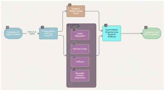 Figure 1 illustrates a schematic overview of the full modeling pipeline used in this study. The process begins with experimental data collection of five key parameters related the wires, which are weight (W), diameter (D), number of wires (N), cross-sectional area (A) and lifespan, or number of execution (cycles) until the wire break, followed by preprocessing and log transformation for variance stabilization. The empirical Weibull-based model establishes a deterministic baseline, while four machine learning models (Linear Regression, Random Forest, XGBoost, and Gaussian Process Regression) provide nonlinear, data-driven predictions. The hybrid Empirical + Residual XGBoost model integrates both physics and data learning. Final evaluation and visualization are performed through a Python-based GUI.
