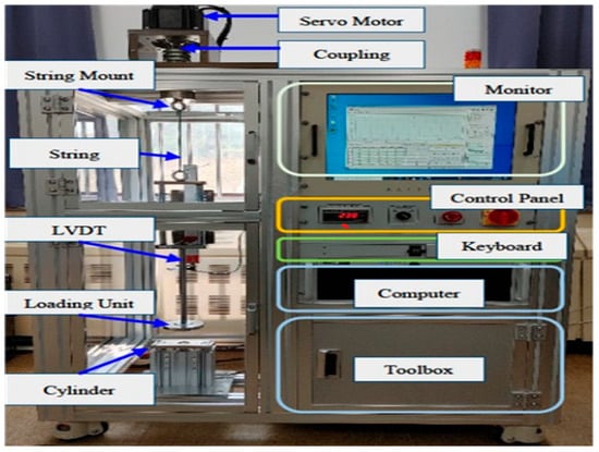 The experimental setup used for fatigue testing of the Twisted String Actuators is shown in Figure 2. The test bench consists of a servo-motor–driven rotary system connected to a string-mounting frame, a load unit with a cylinder for tension application, and a displacement sensor (LVDT) for real-time elongation tracking. The entire assembly integrates a control panel, data-acquisition monitor, and computer system for automatic recording of cycles to failure, ensuring reproducible test conditions. This apparatus enabled precise control of loading parameters (W, D, N) and accurate detection of fracture points across all 144 experimental runs.
