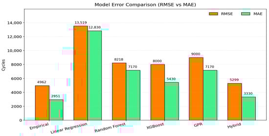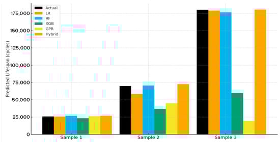 The empirical model, derived from Weibull-based regression, effectively represented deterministic relationships among weight (W), diameter (D), and number of wires (N), reflecting established mechanical reliability principles. However, it was unable to capture nonlinear or stochastic deviations inherent to real-world fatigue phenomena. In contrast, the ML models: Linear Regression (LR), Random Forest (RF), Extreme Gradient Boosting (XGBoost), and Gaussian Process Regression (GPR) learned complex relationships directly from the data, substantially improving prediction fidelity, especially under variable geometric and loading conditions.