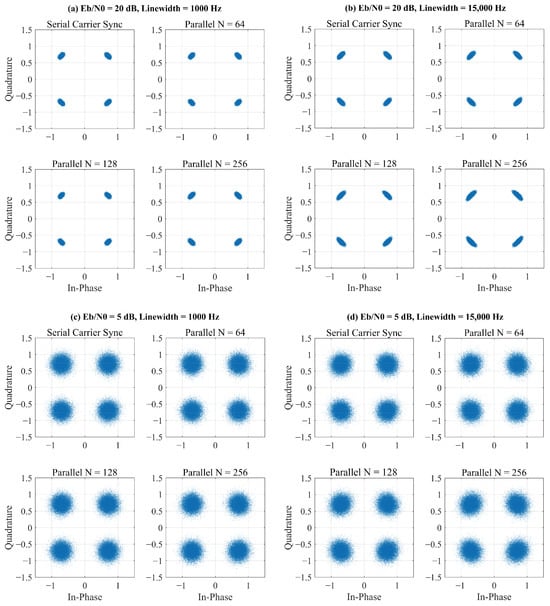 To assess the impact of the parallel architecture on the end-to-end system fidelity, we evaluated the Bit Error Rate (BER) performance. Figure 6 shows the constellation diagrams after carrier recovery for both serial and parallel loops under various conditions. In all cases, the parallel loop successfully recovers the carrier, resulting in clean, well-defined constellation points.